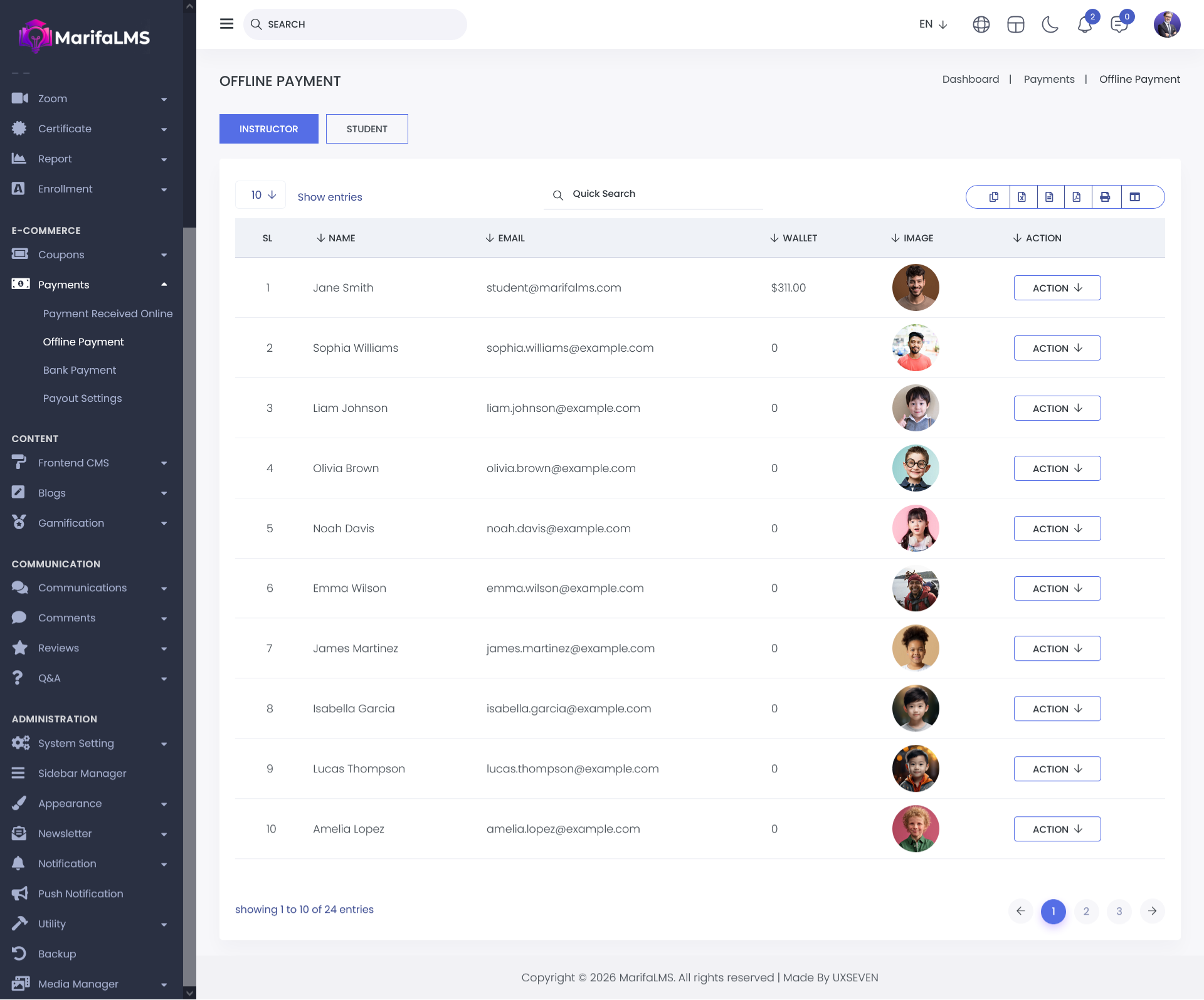 This section provides a consolidated view of offline payments for both instructors and students. The list includes the following details: