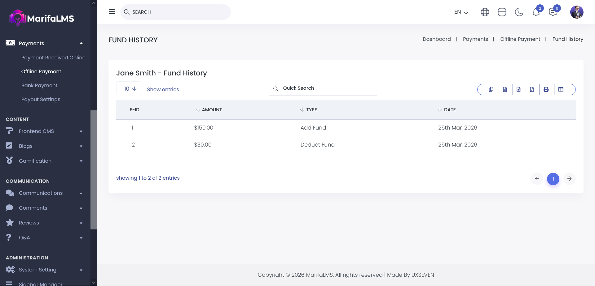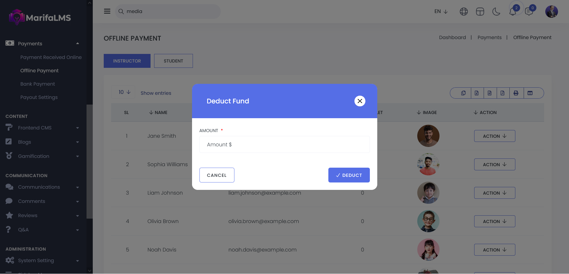 By clicking on the Action button, you can add funds, deduct funds, and view the fund history for both the instructor and student panels.
