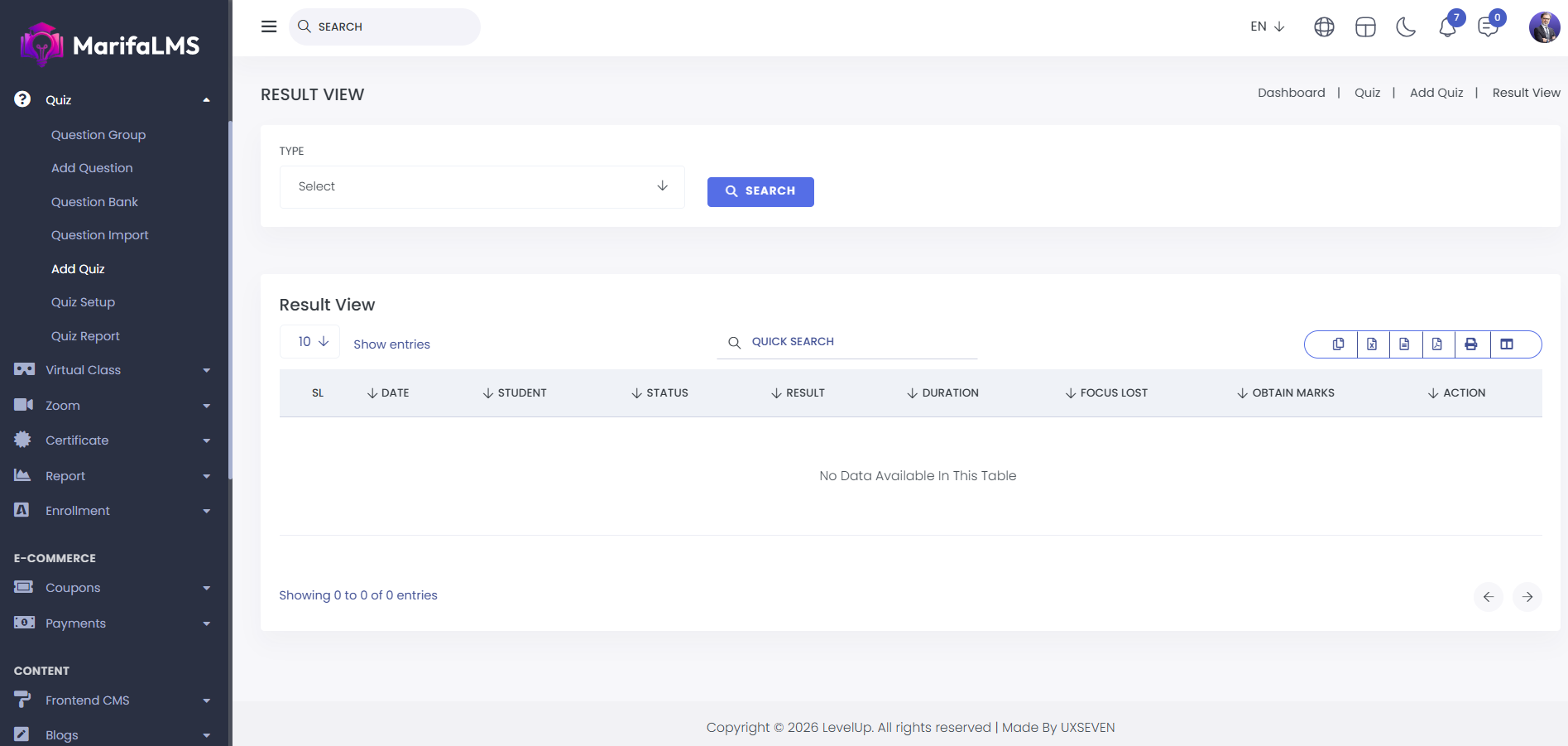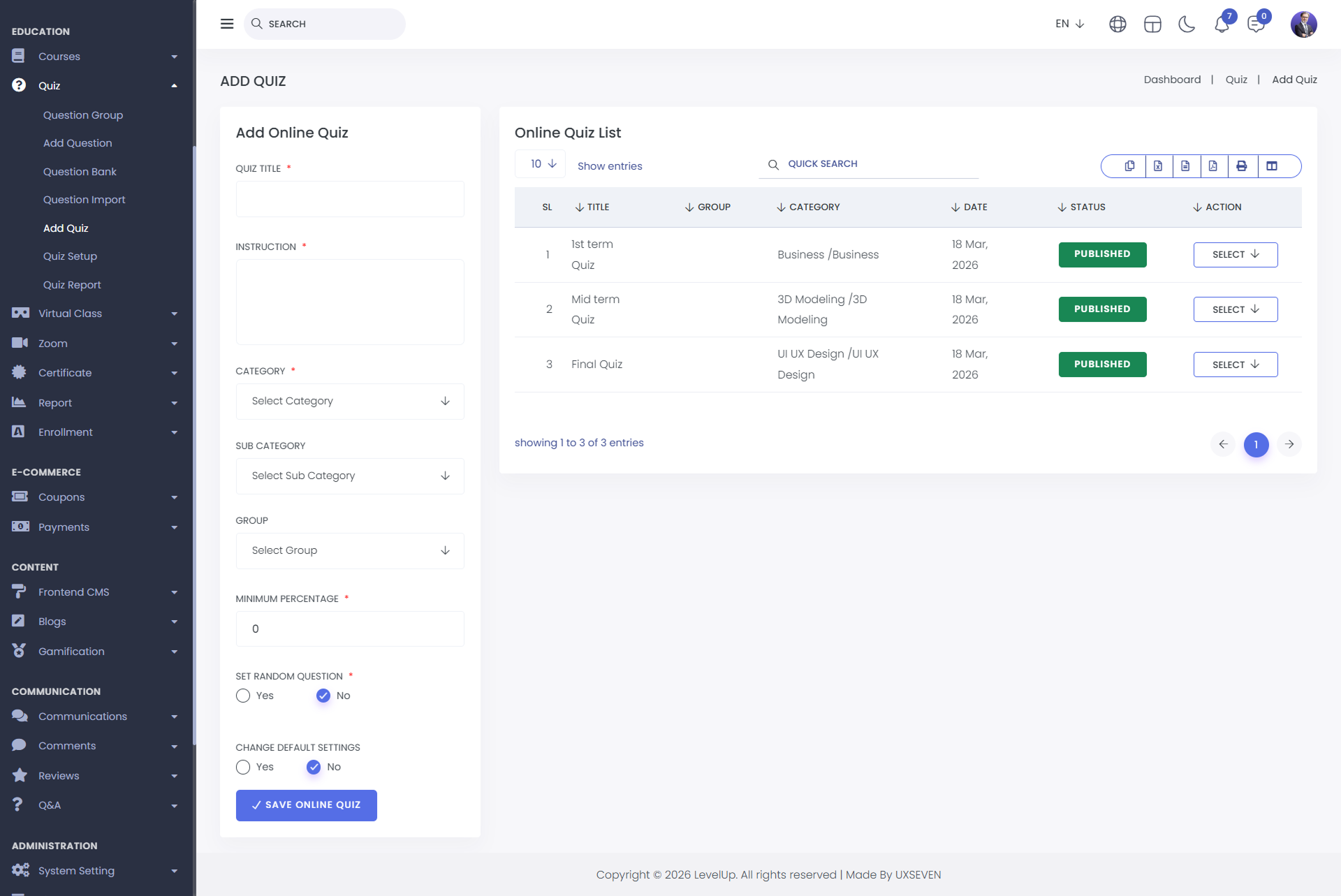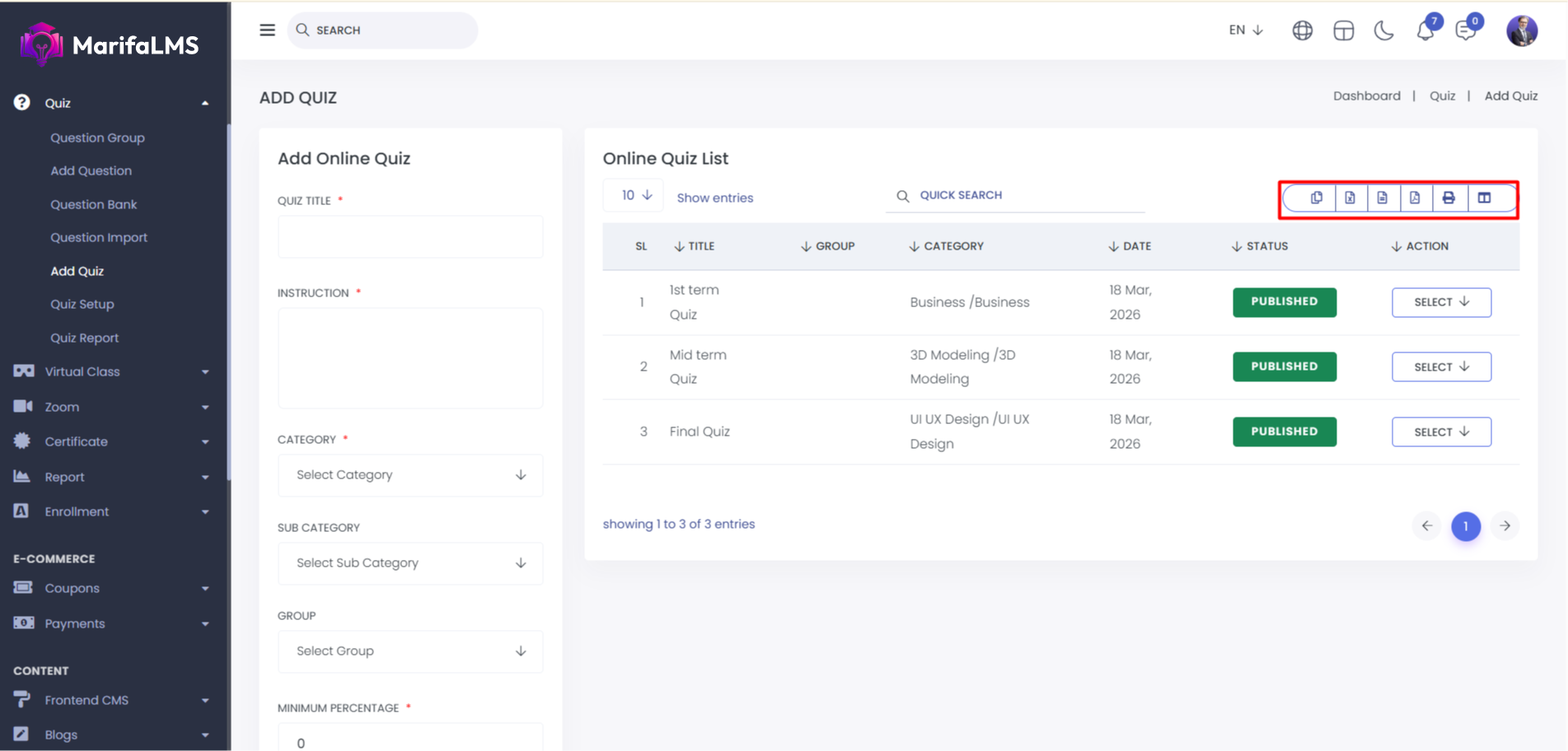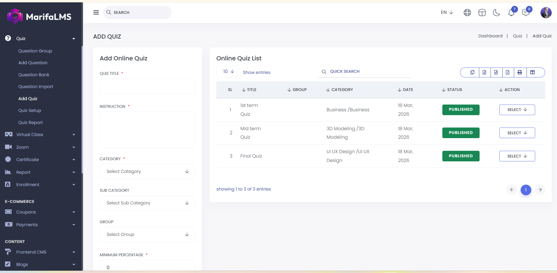 You can see the online quiz list from here. You can see the SL, title, group, category, date, status, Action.