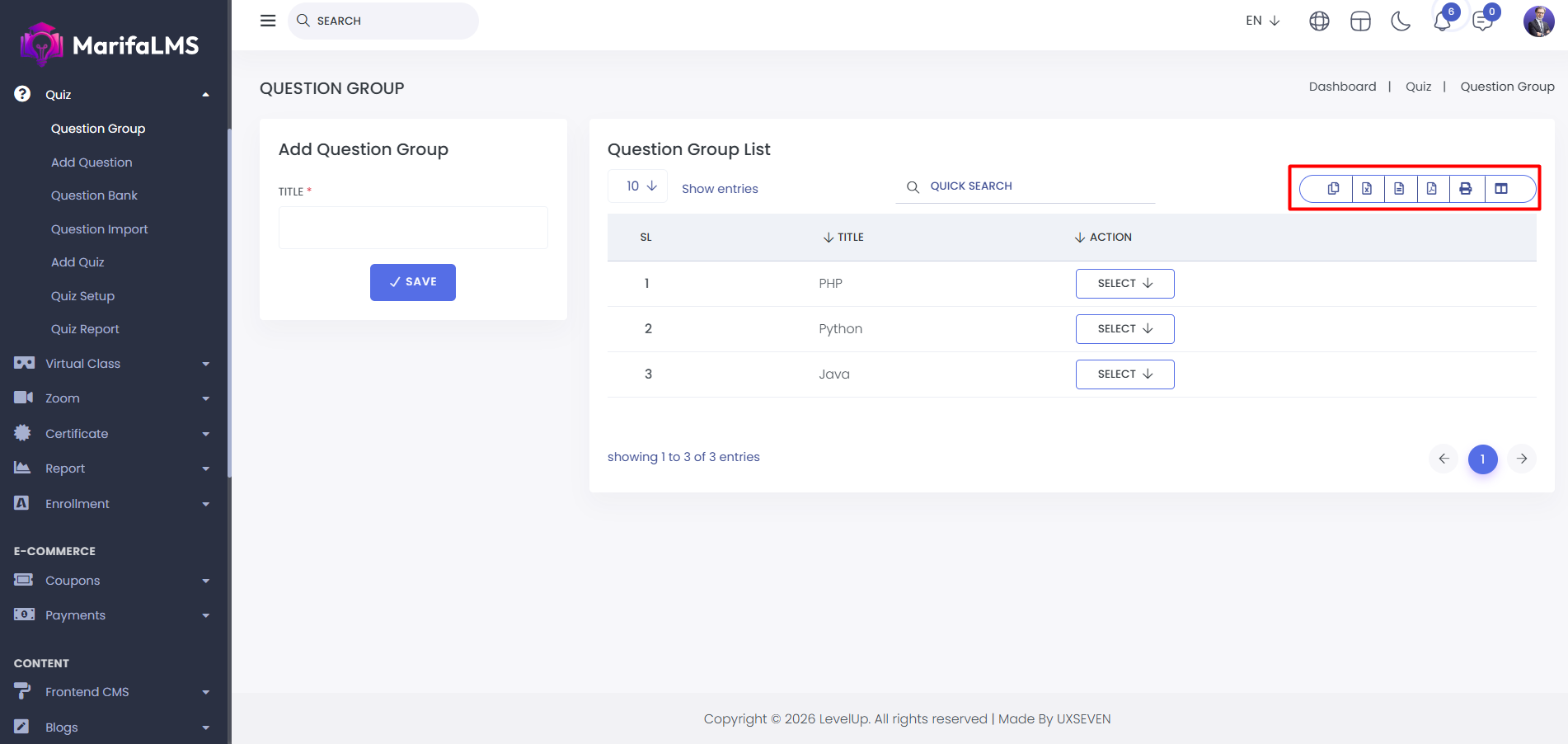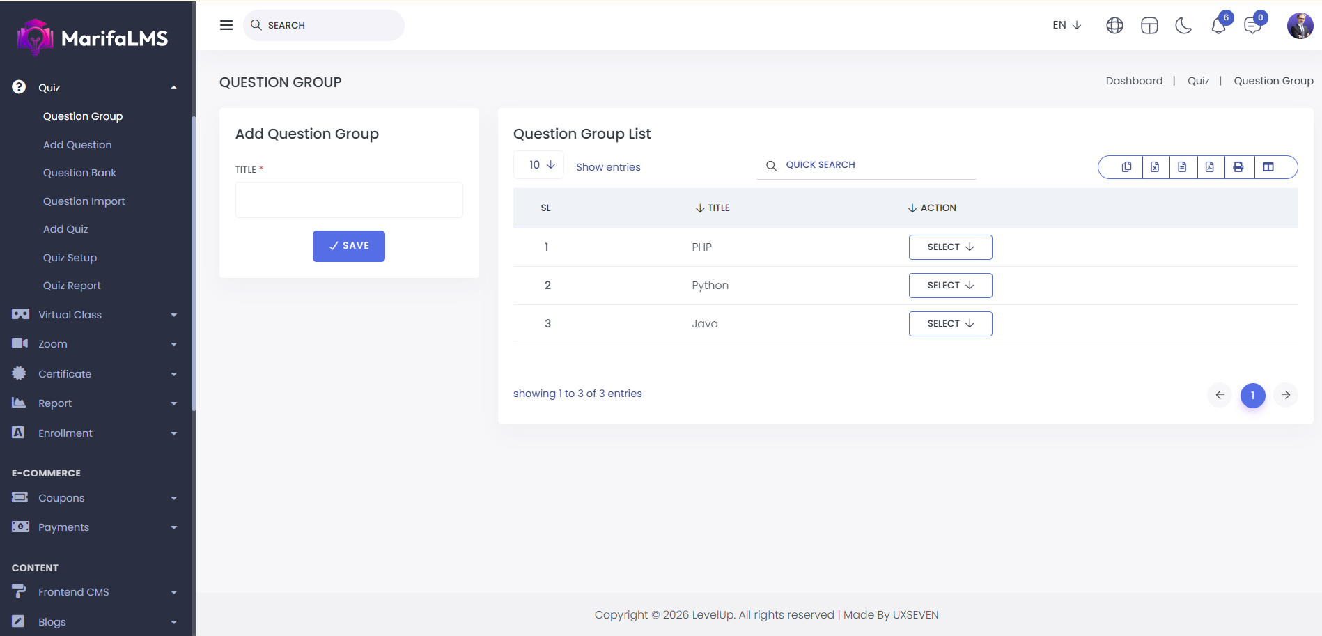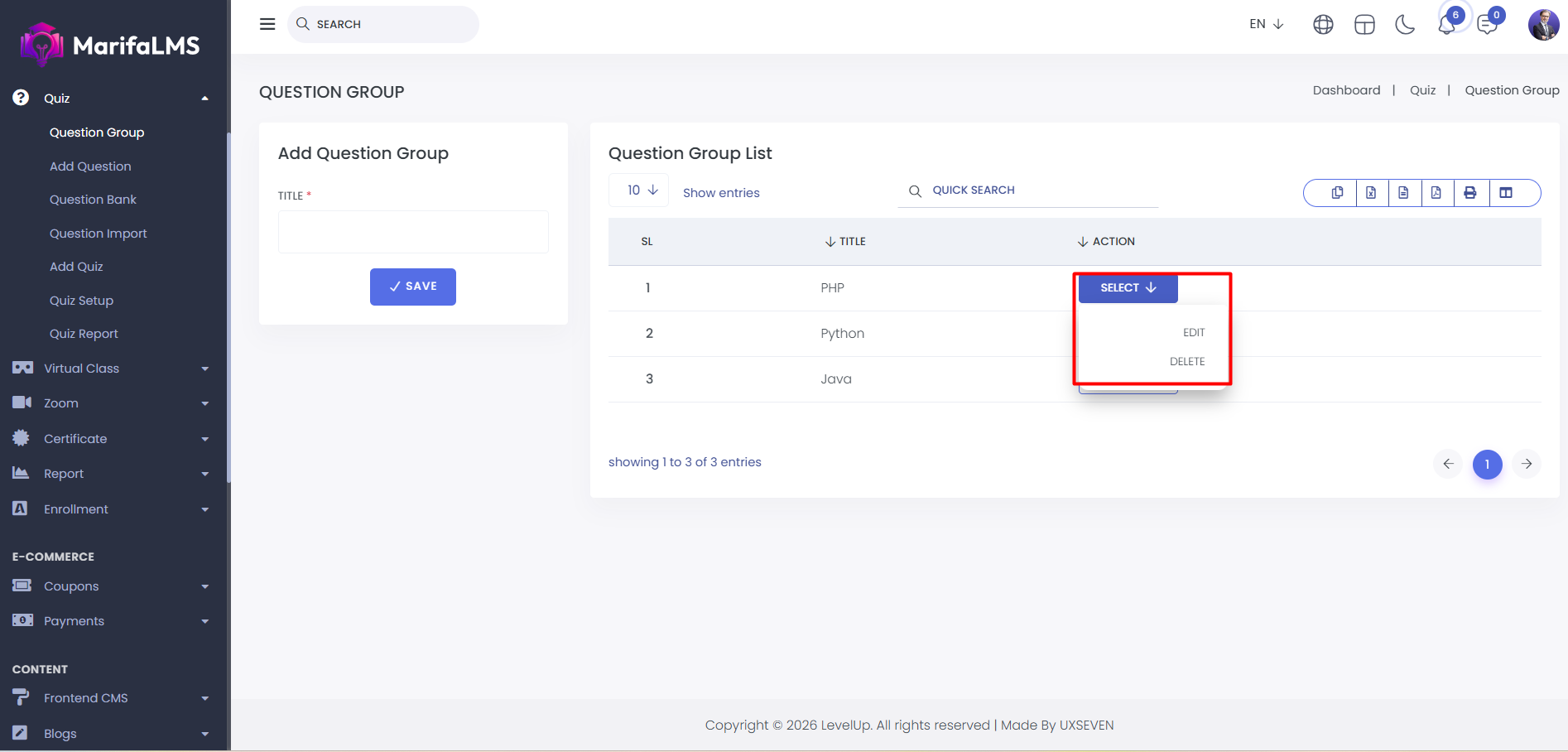 Question Group: From here you can see the question group list at a glance. You can see the Serial Number (SL), title & action.
