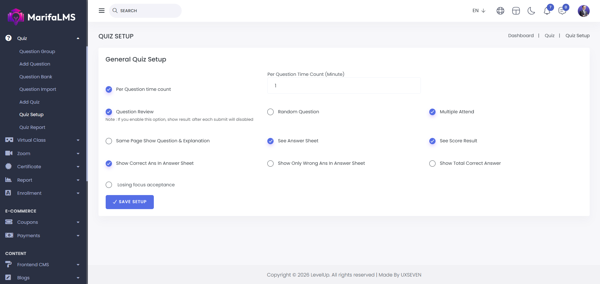 Quiz Setup: Here, you can set up the main quiz settings. You can choose a time limit for each question, add a review section for questions, and decide if questions appear randomly or can be attempted multiple times. You can also show questions and their explanations on the same page, view the answer sheet, and see the final score. The answer sheet will show the correct and wrong answers, the total correct answers, and whether the quiz taker lost focus.
