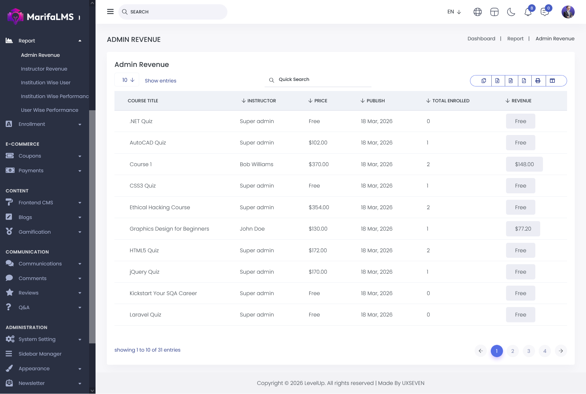 The Admin Revenue List shows all the revenue settings created by the Administrator for Courses, Quizzes, and Live Classes in the Level Up system.