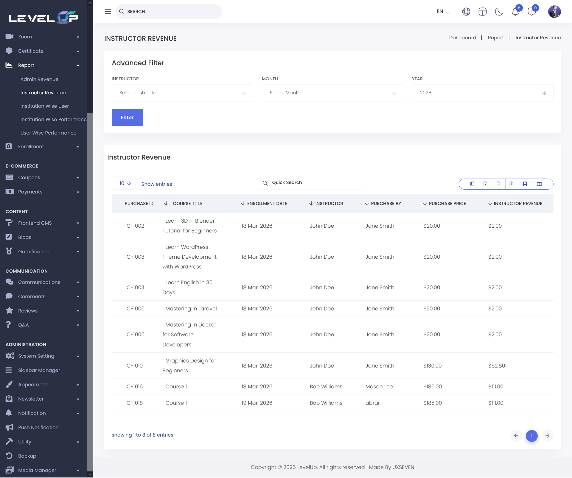 The Instructor Revenue List gives you a detailed, transaction-level view of all purchases made on the platform.