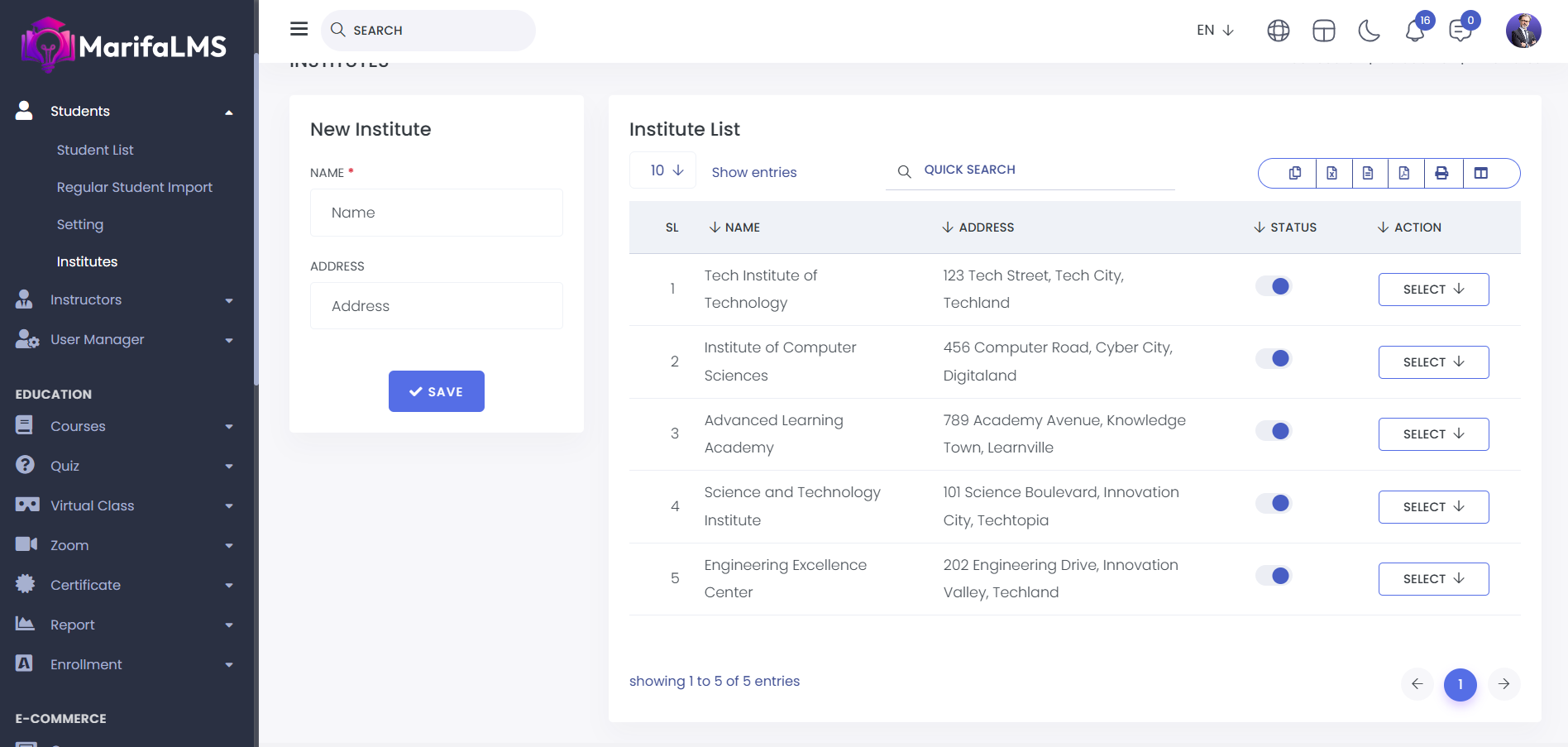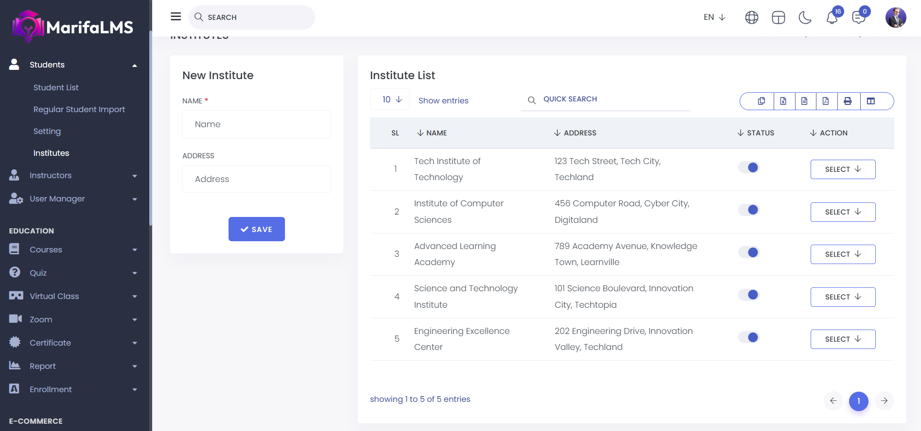 Institutes: From here, you can add new institutes and view the complete list of institutes. You can see details such as SL, Institute Name, Address, Status, and Action.