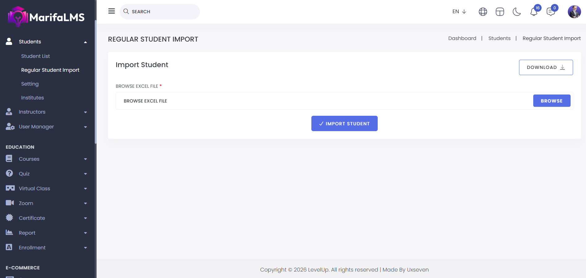 Short Direction: {Levelup LMS > Dashboard> Regular Student Import> Import Student> Download> Browse Excel File> Import Student.}