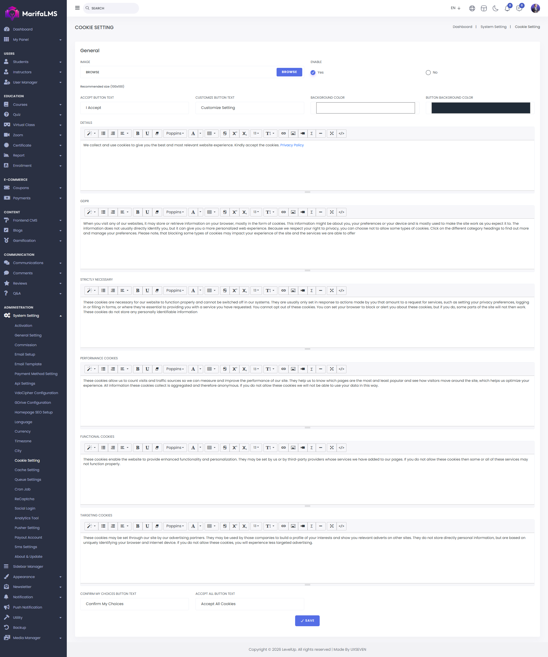 Cookie And GDPR Setting: Here, you can configure cookie settings. You can upload an image, enable/disable cookies, and customize various text options such as the accept button, custom button, details text, GDPR text, and more. You can also set the background color, button background color, and cookie categories like performance, functional, and targeting cookies. Once you've set everything, click "Save" to update your settings successfully.