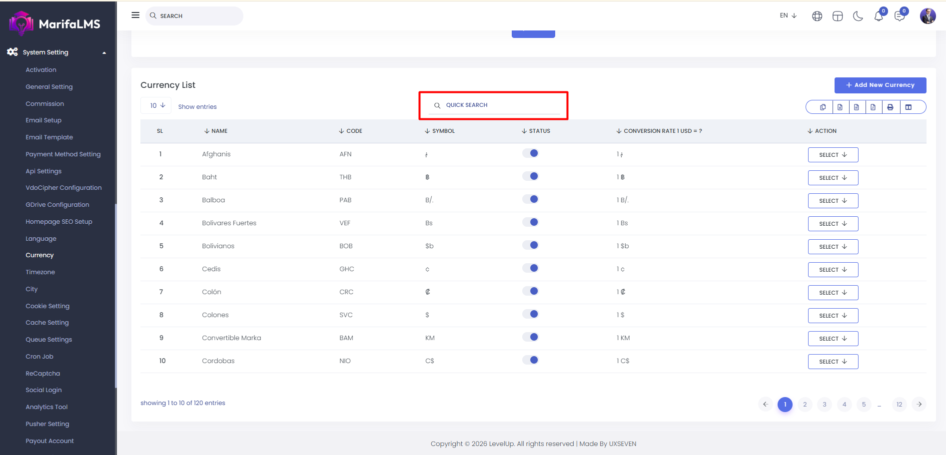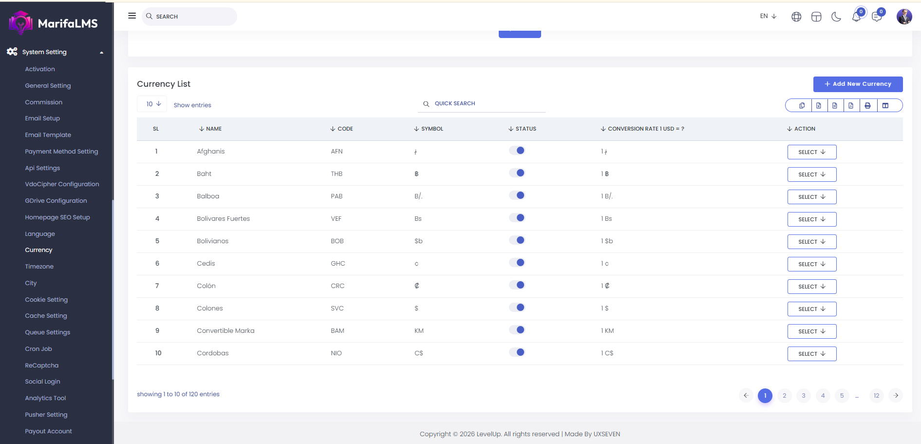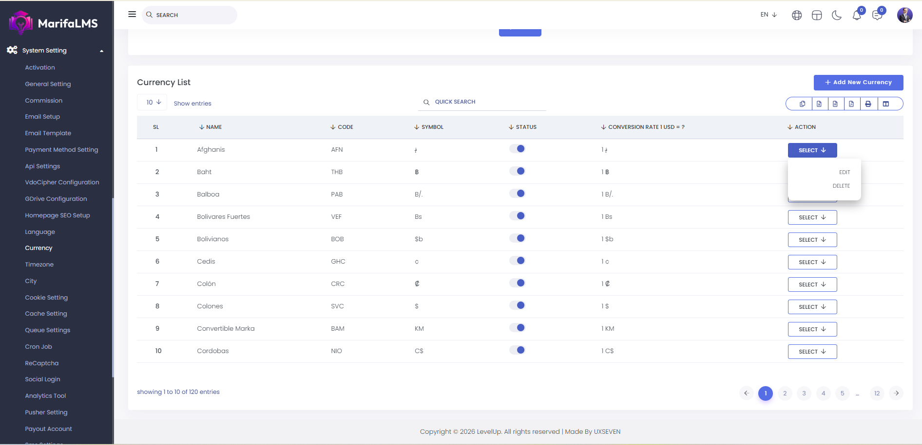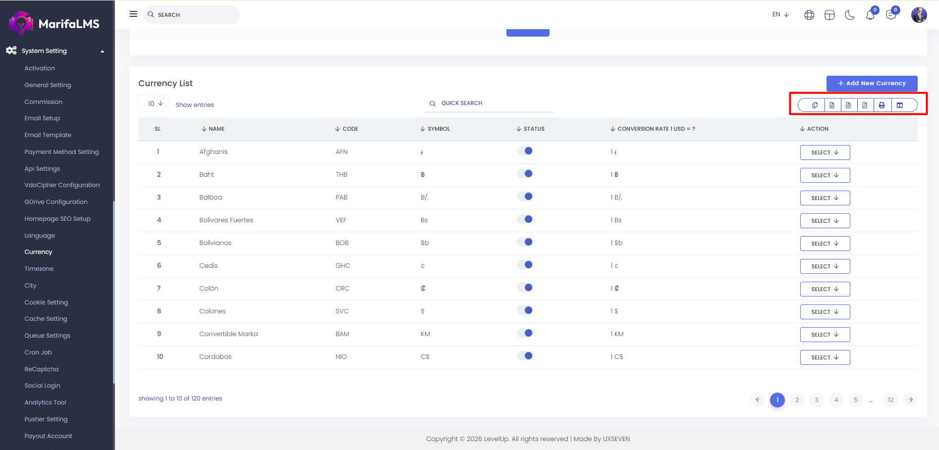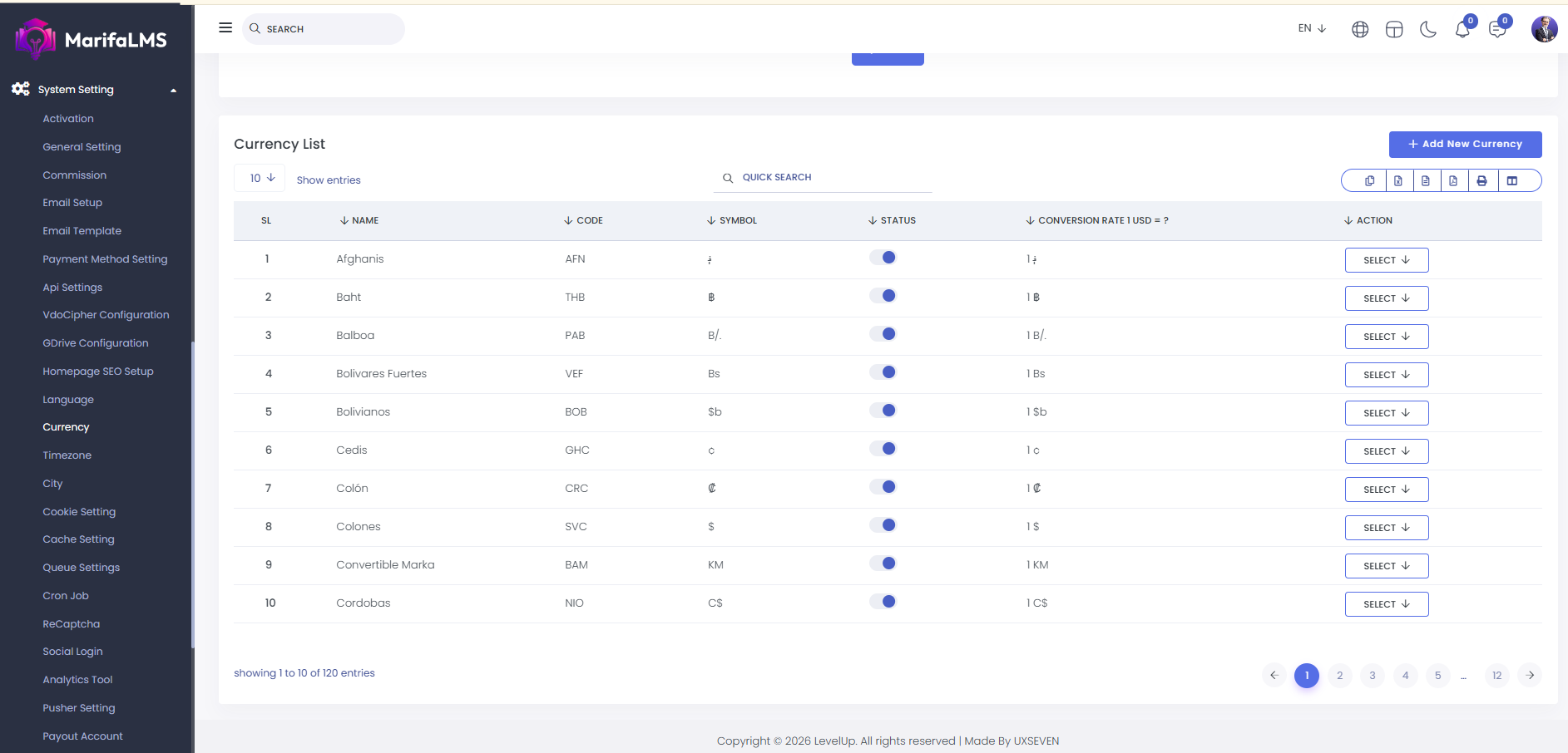 Here, you can view the full currency list, including the name, code, symbol, status, conversion rate to USD, and available actions.