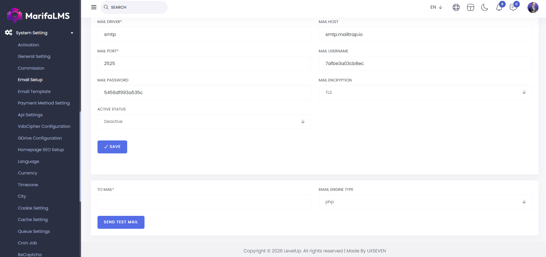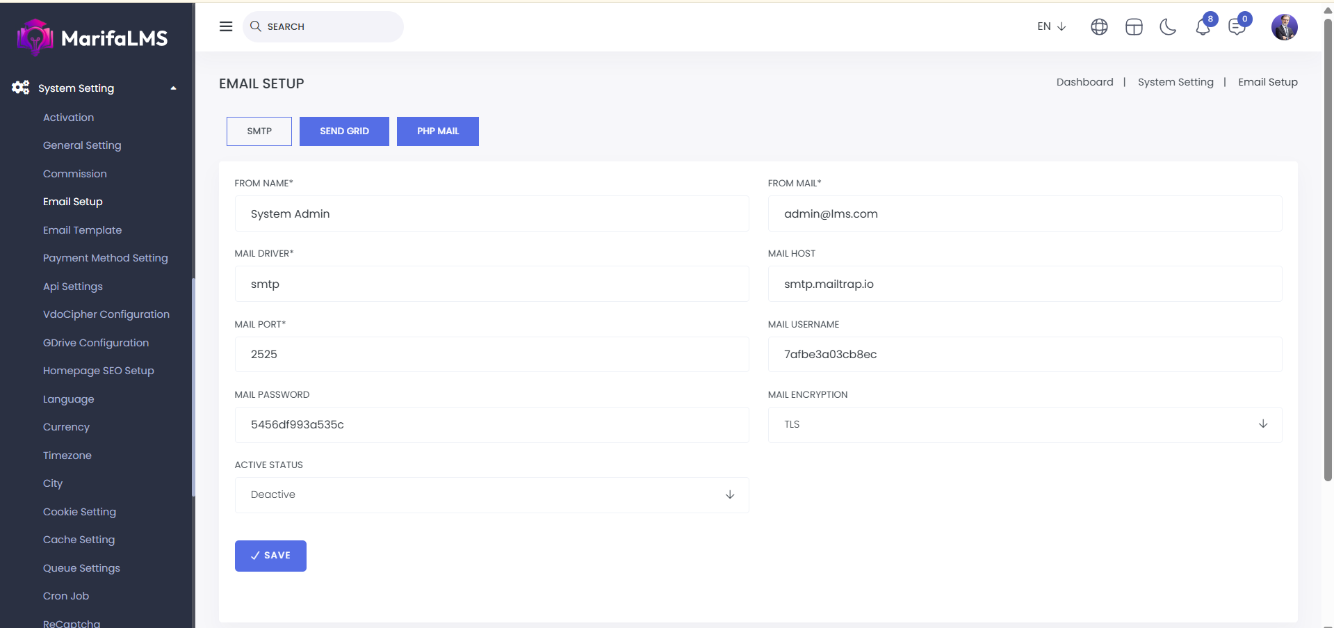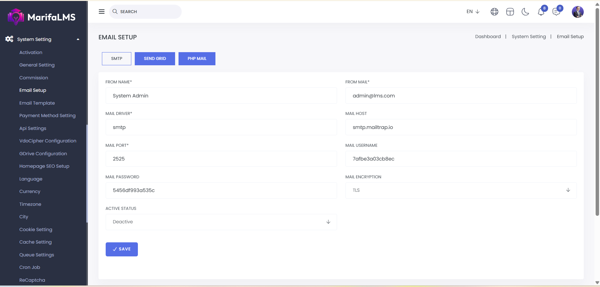SMTP: Here, you can set up SMTP by configuring the sender's name and email, mail driver, host, port, username, password, encryption, and active status. After filling in the details, click the "Save" button to complete the SMTP setup.