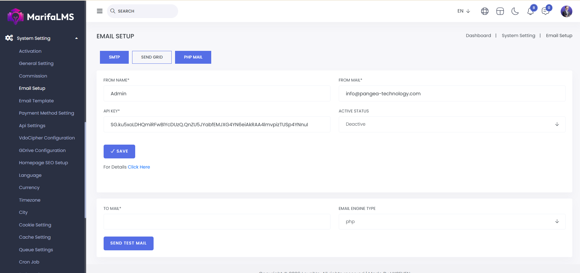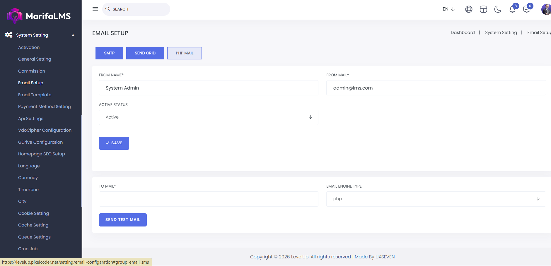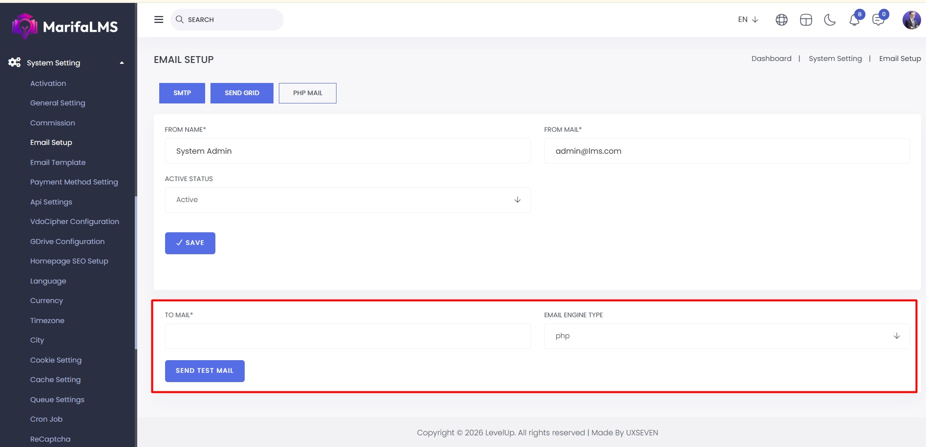 PHP Mail: Here, you can set up PHP mail by entering the from name, email, and active status. After setting it up, click "Save" to complete the setup.