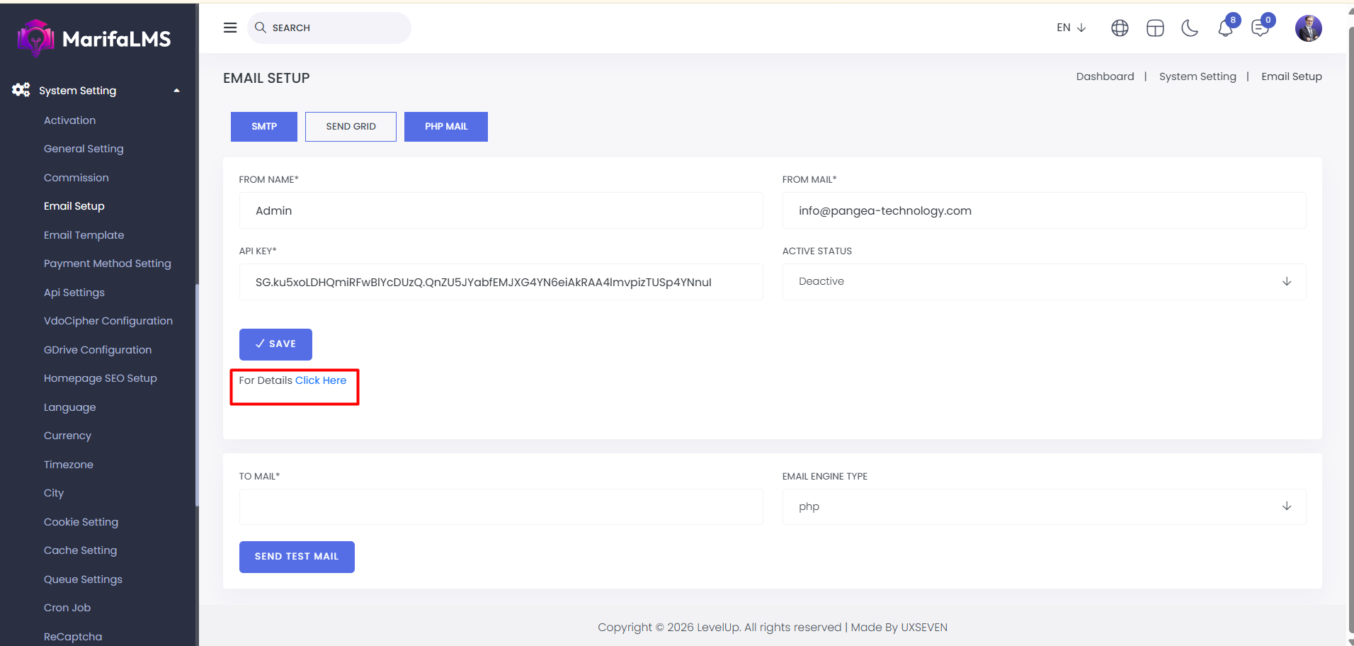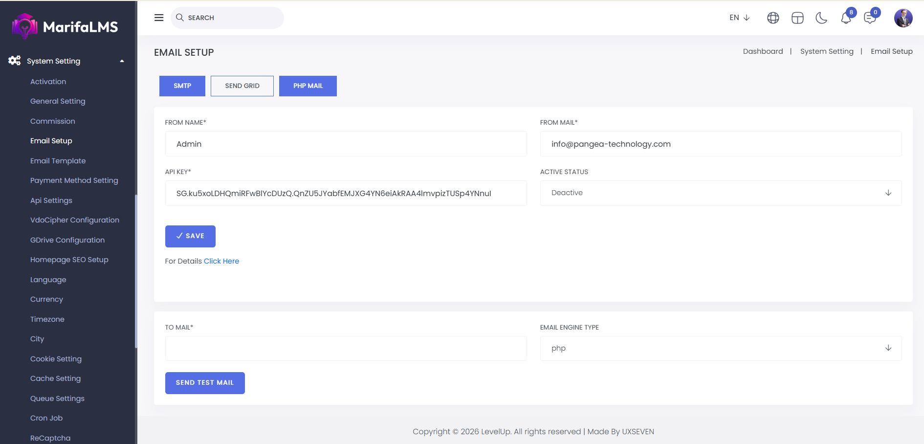 Send Grid: Here, you can set up SendGrid by entering the form name, email, API key, and status. After filling in the details, click "Save" to successfully set up your SendGrid.