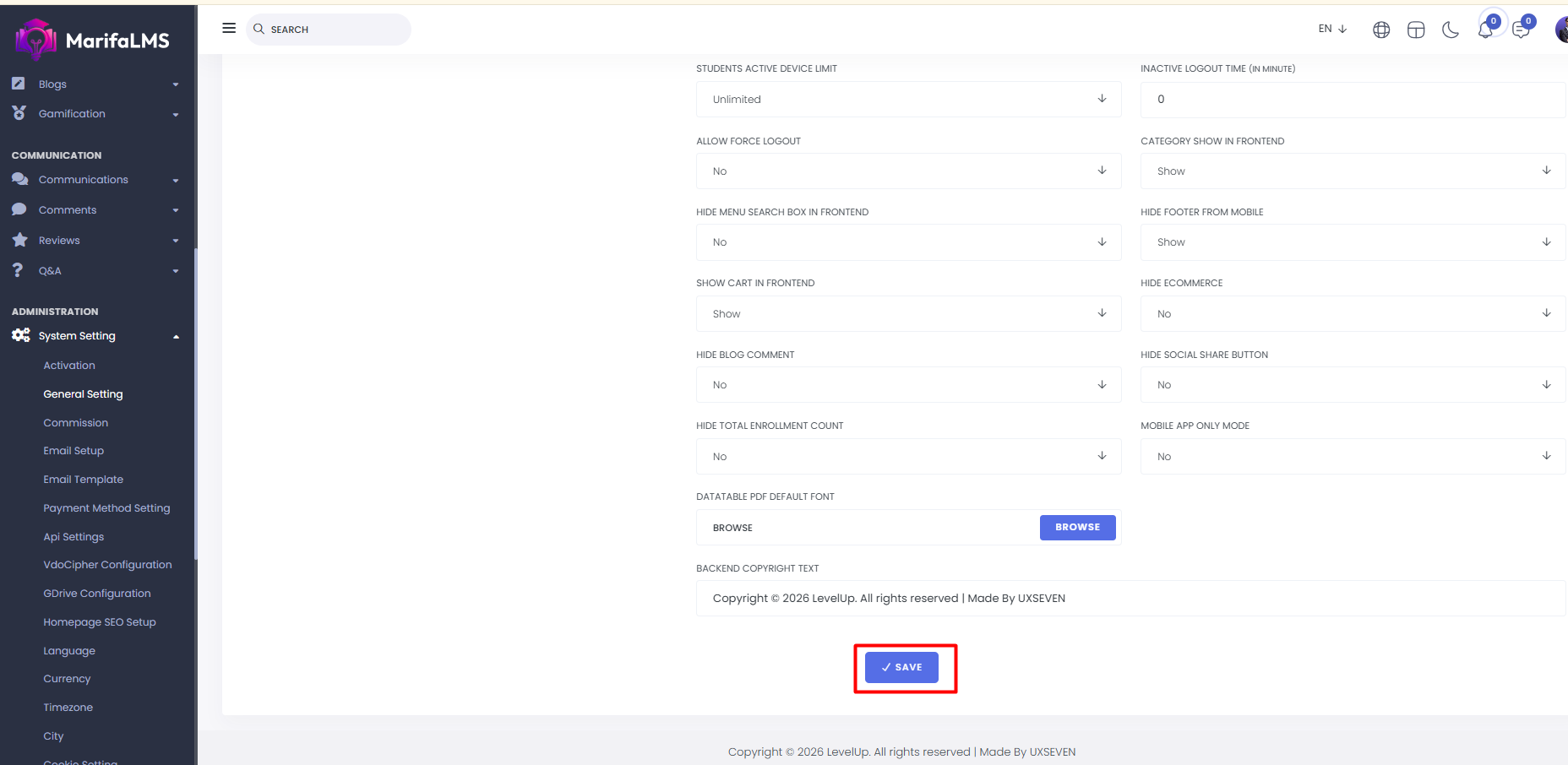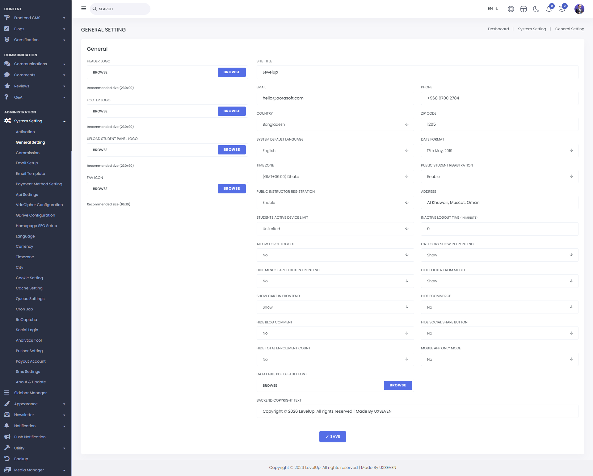 Here, you can set various website settings, including the title, email, phone number, country, zip code, and address. You can also configure the system's default language, date format, and time zone. Additionally, you can control whether public students and instructors can register, set the student device limit, and define the inactive logout time. You can show or hide the force logout system, category display, fixed navbar, search box, footer on mobile, and the cart. Additionally, you can toggle the visibility of the ecommerce section and blog comment option. From here, you can manage settings such as showing or hiding the social share button, enrollment count, and setting the homepage. You can choose the post-login redirect page, enable mobile-only view, upload the default PDF font, and update company and copyright texts.