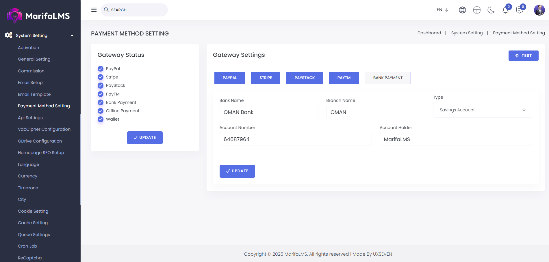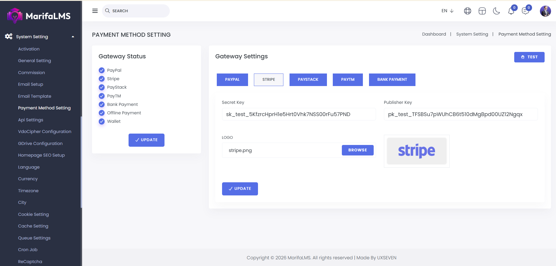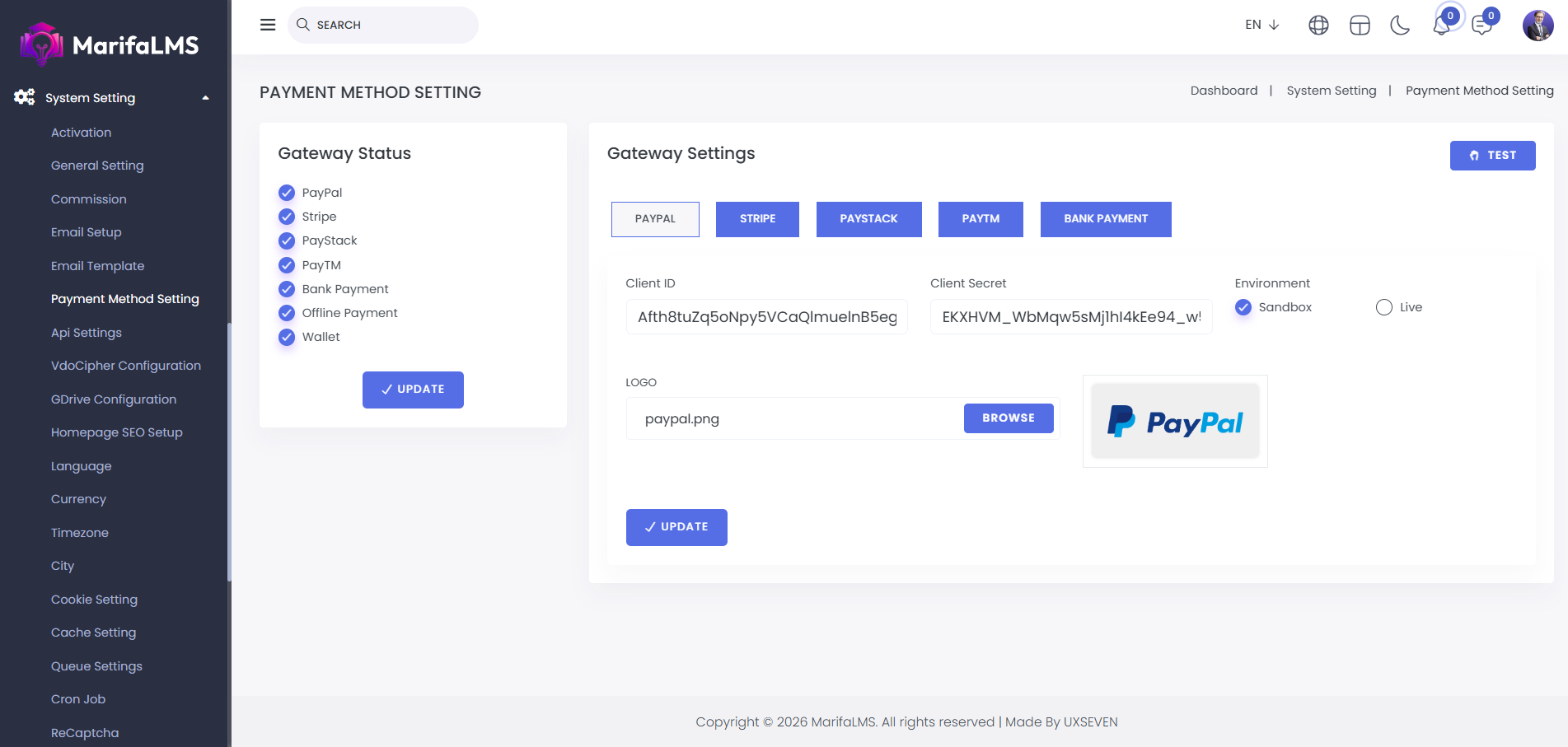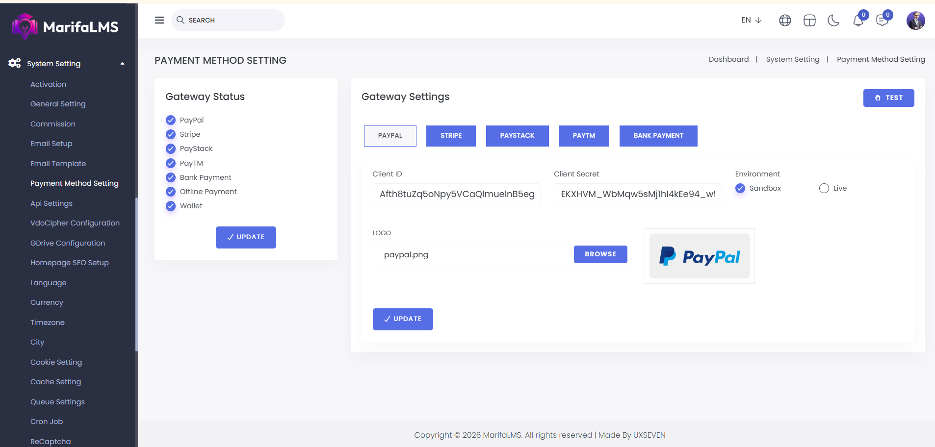 Paypal: Here, you can set up the PayPal payment gateway by entering the client ID, secret, and environment. You can also upload an image. After setting it up, click "Update Setting" to save the changes successfully.