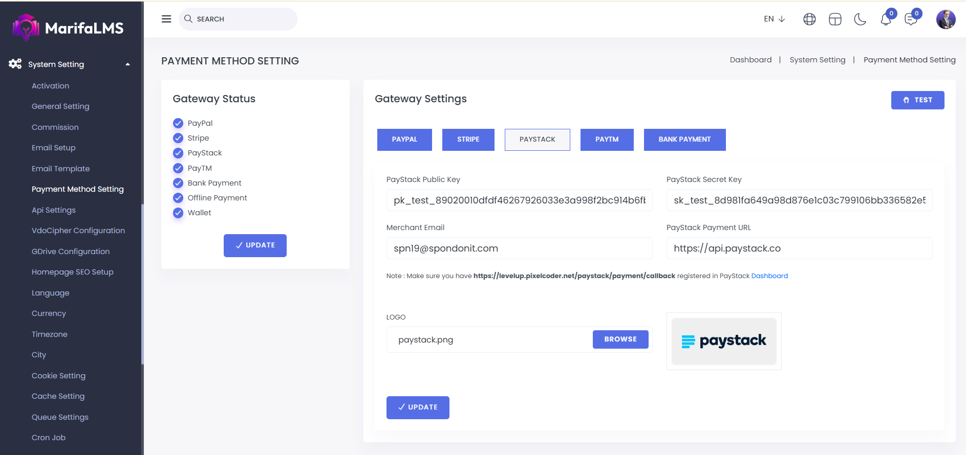 Paystack: Set up Paystack by entering the publish key, secret key, merchant email, and payment URL. You can also upload a logo. Click "Update" to save changes.