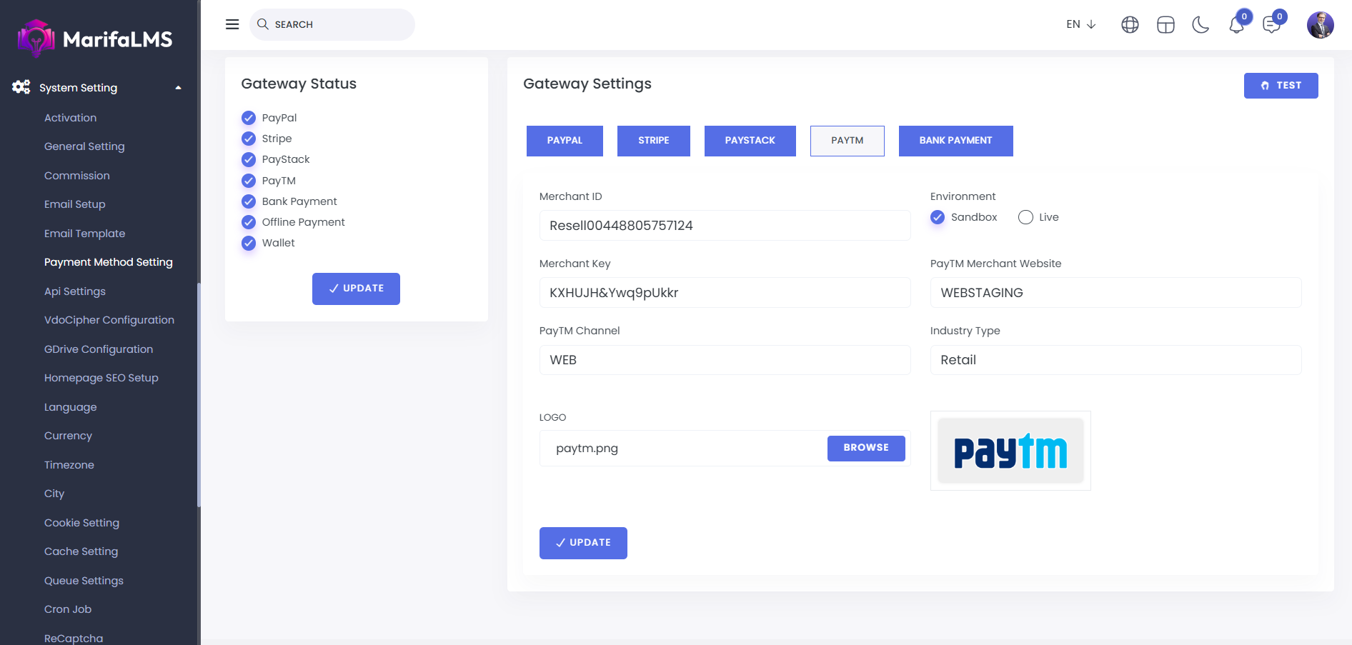 Paytm: Set up Paytm by entering the merchant ID, environment, merchant key, merchant website, Paytm channel, and industry type. You can also upload a logo. Click "Update" to save changes successfully.