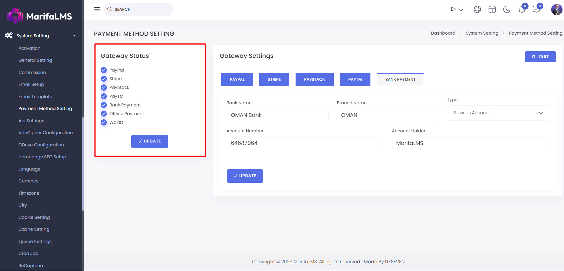 Payment Method Setting: Here, you can configure the payment method settings. Multiple payment gateways are available, and you can set them up from here.
