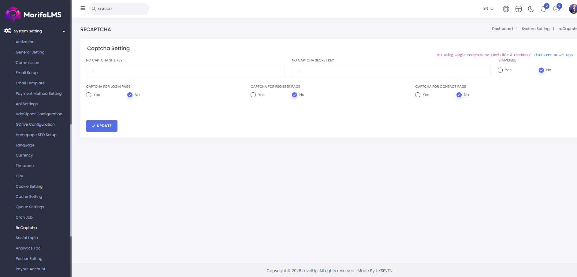 Here, you can enable reCAPTCHA for the login page, registration page, and contact page. After configuring, click "Update" to save your settings successfully.