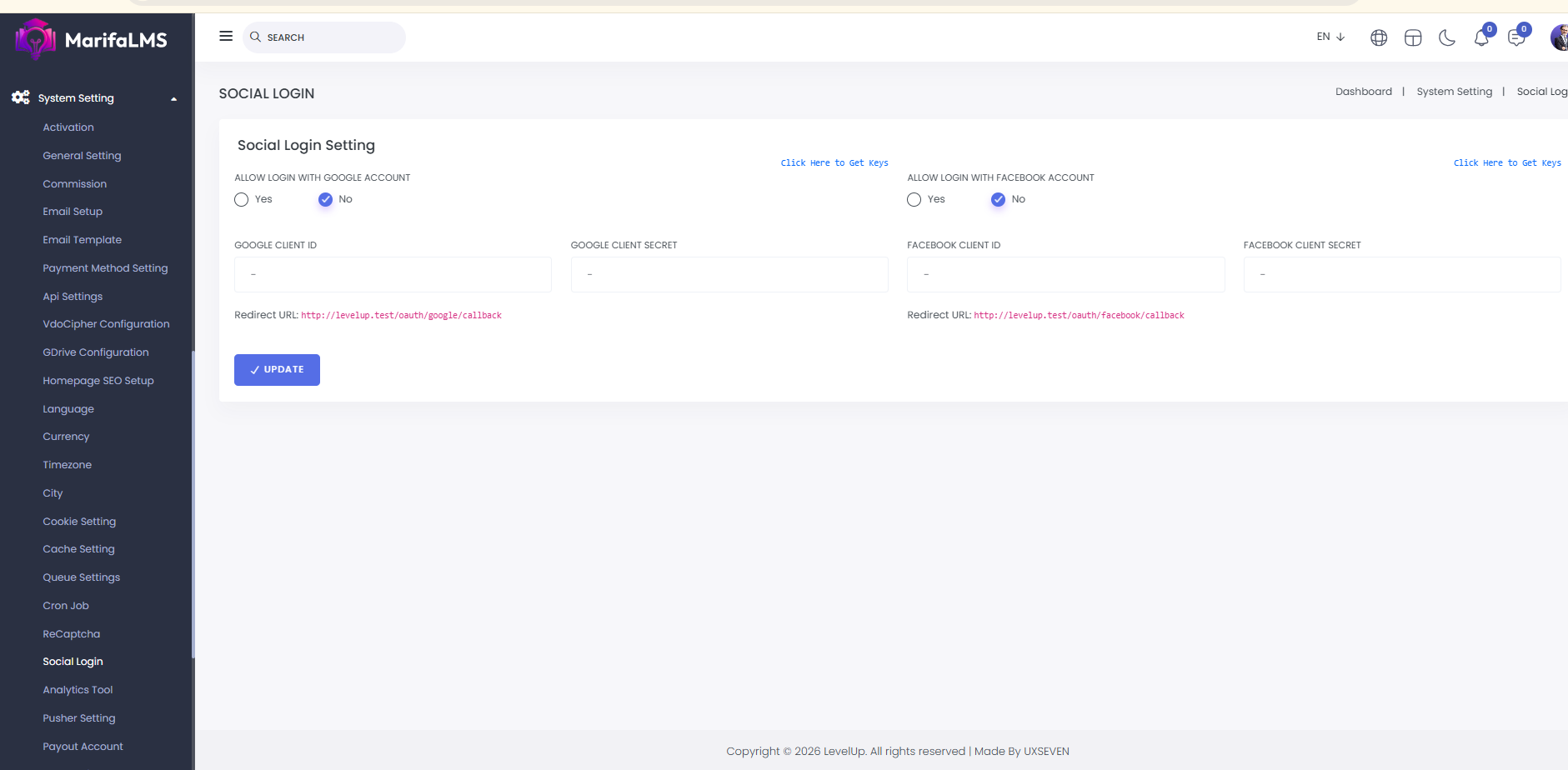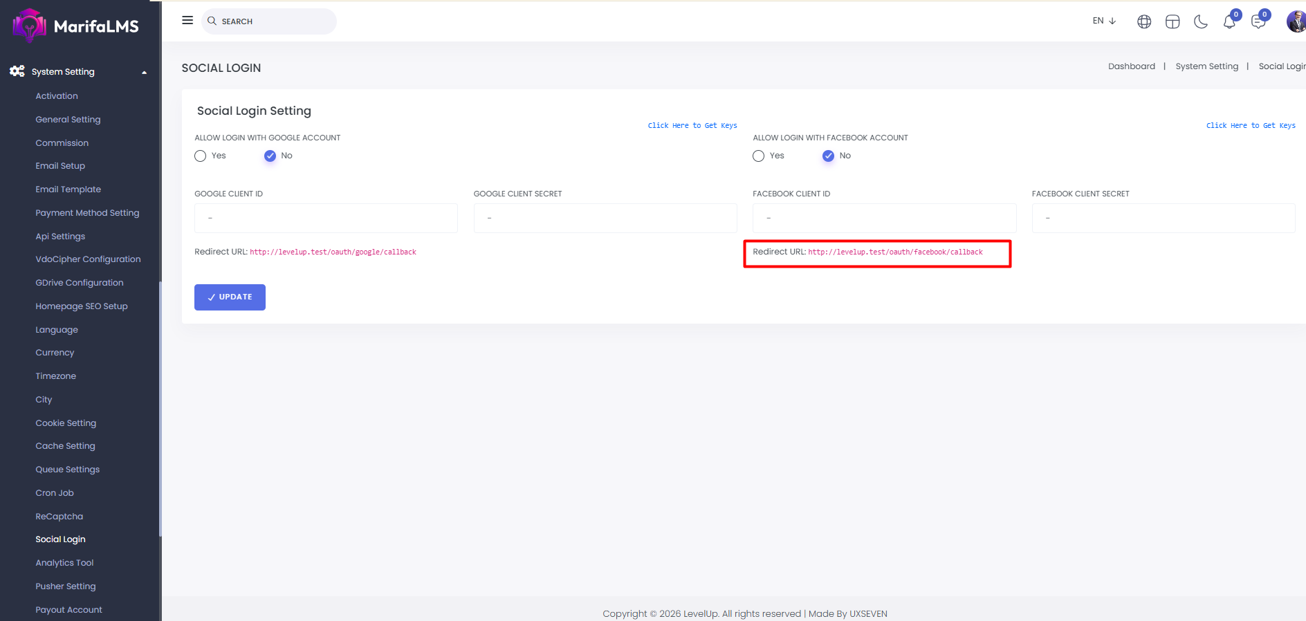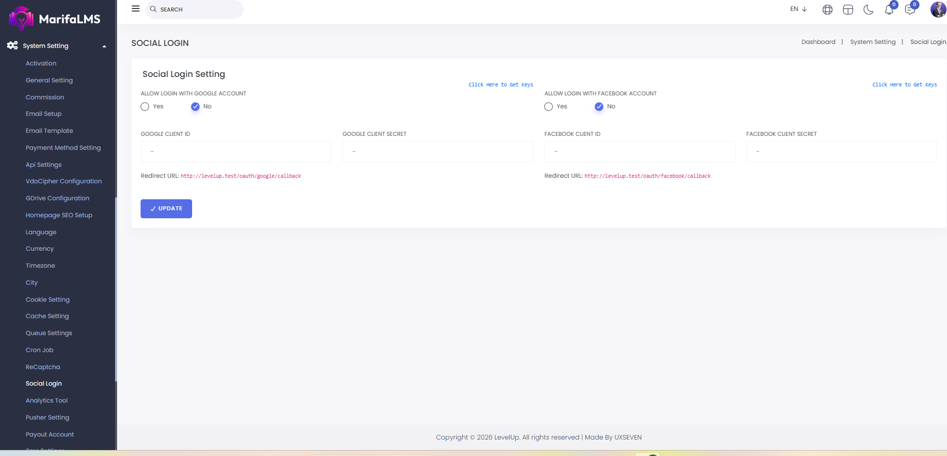 Social Login: From here you can set login with google account and login with facebook account.