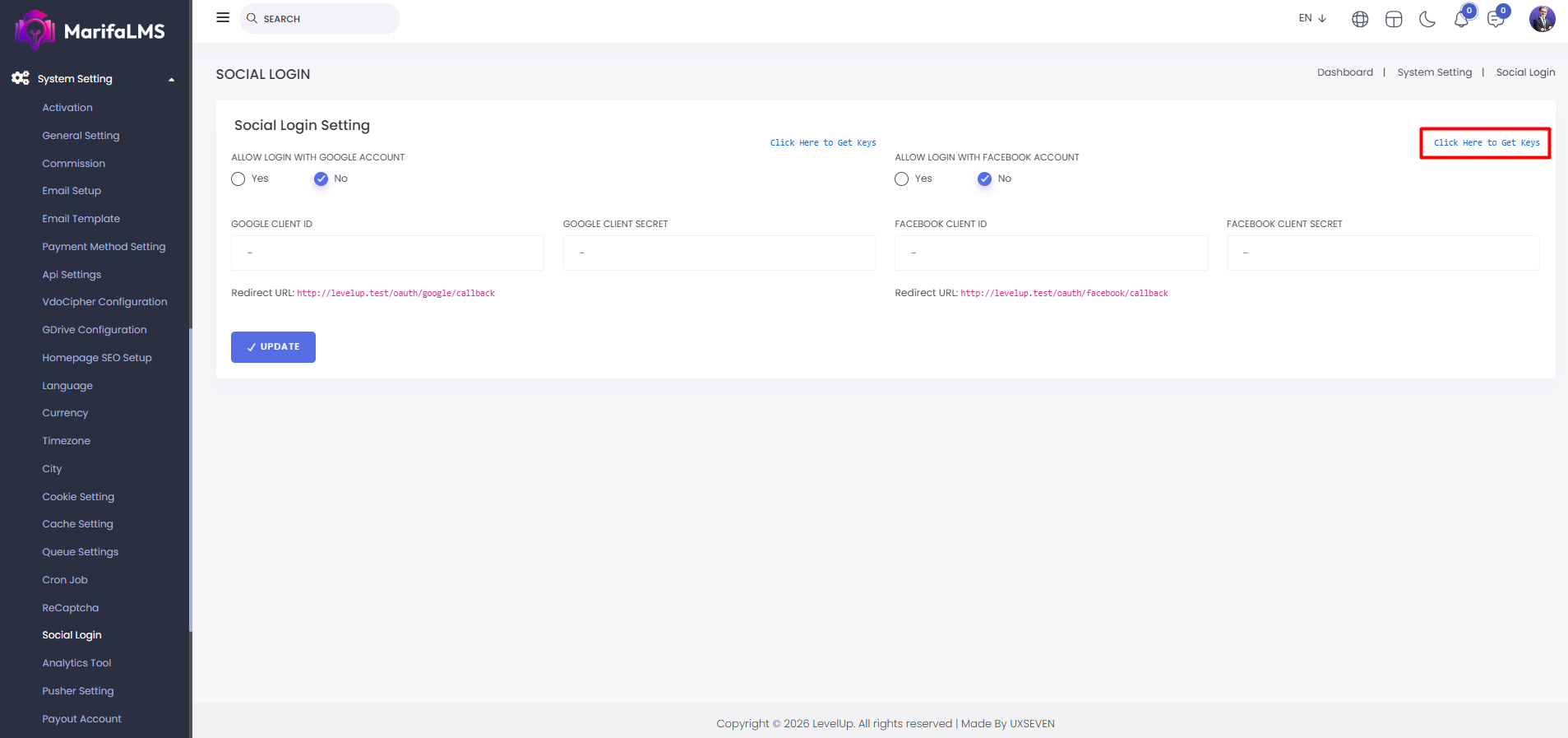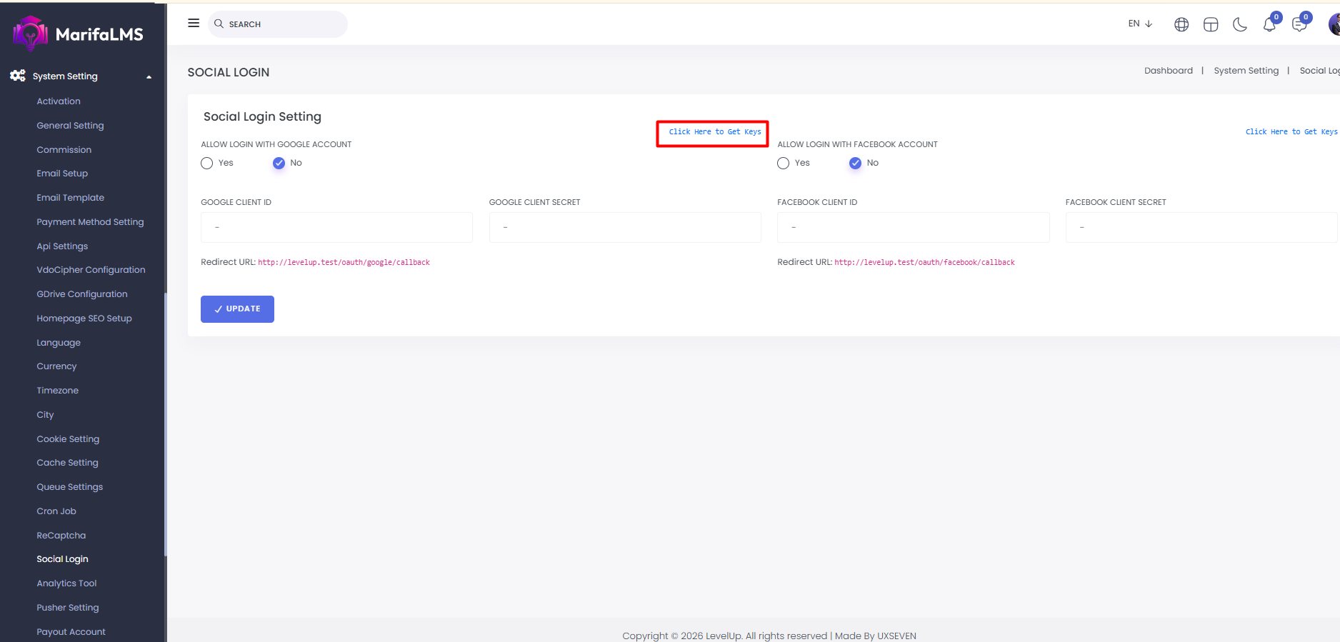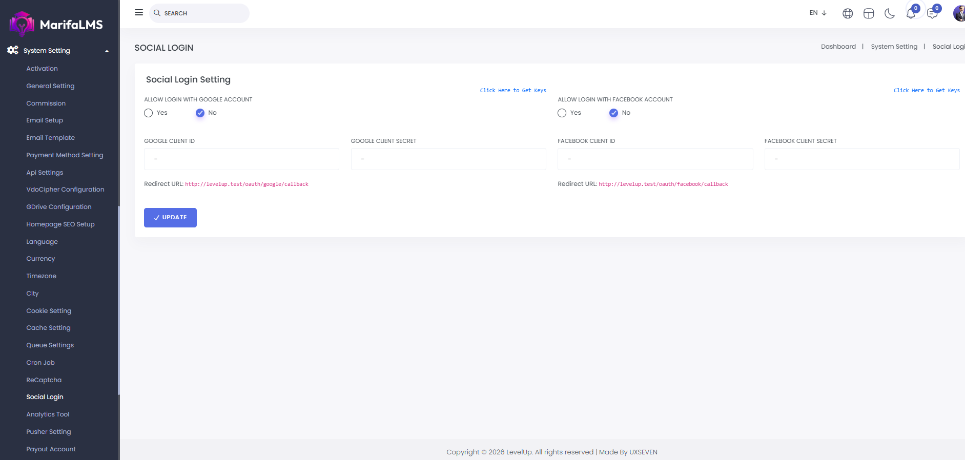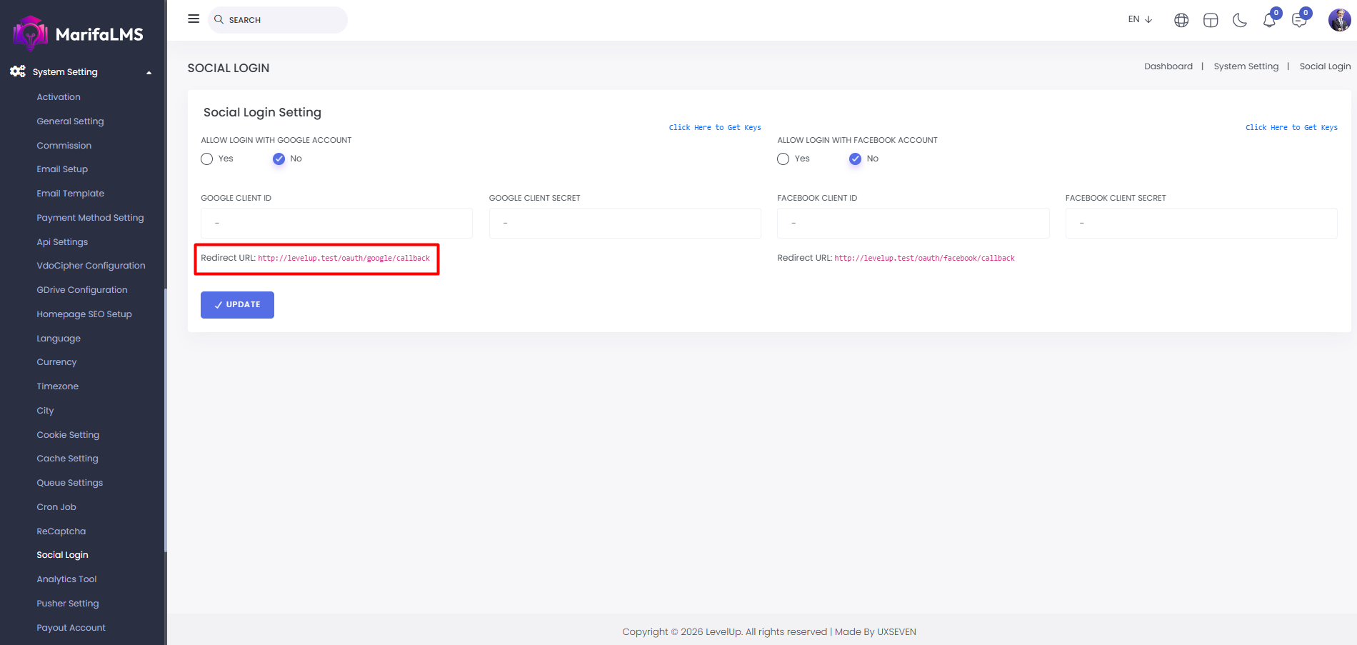 Social Login: From here you can set login with google account and login with facebook account.