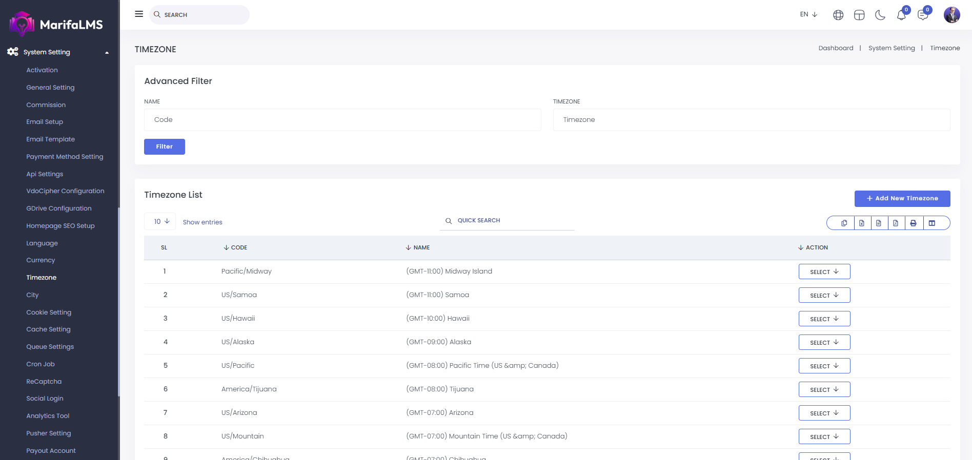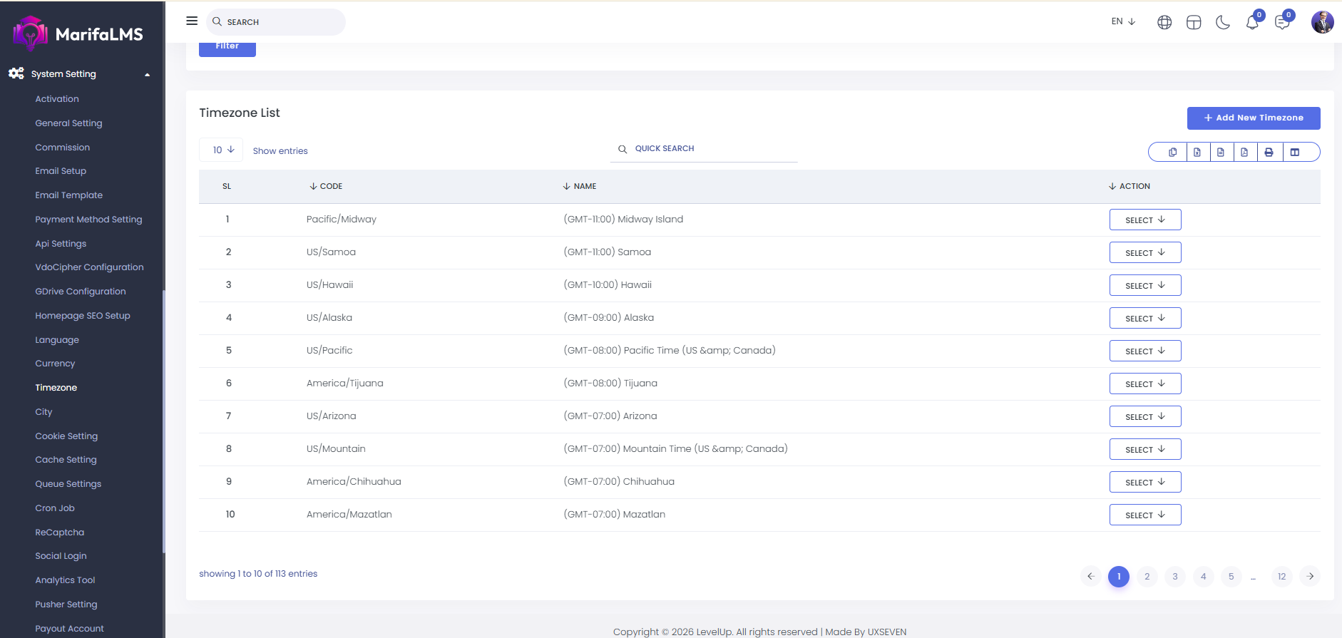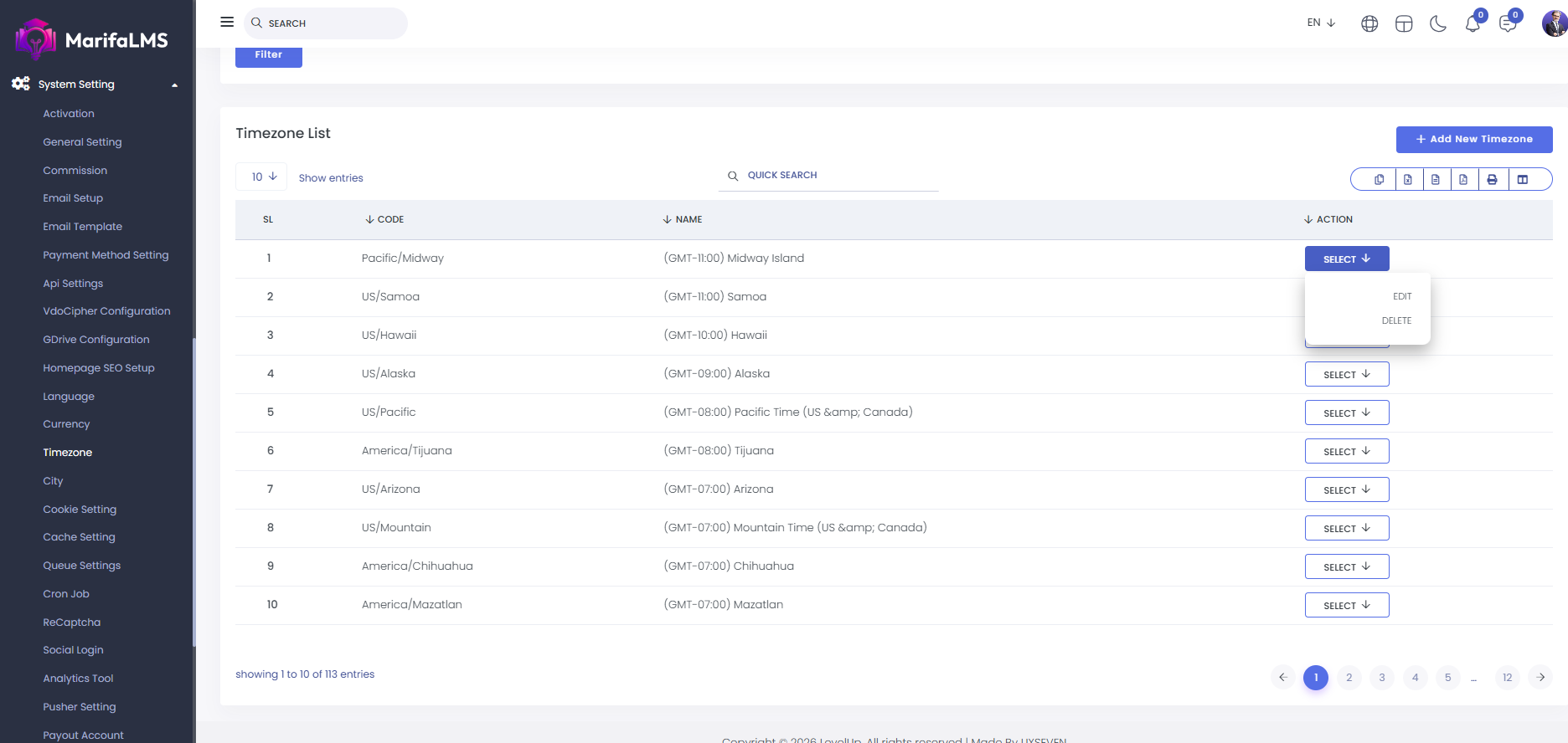 Time zone: Here, you can view the complete time zone list with details, including the name, country, and available actions.