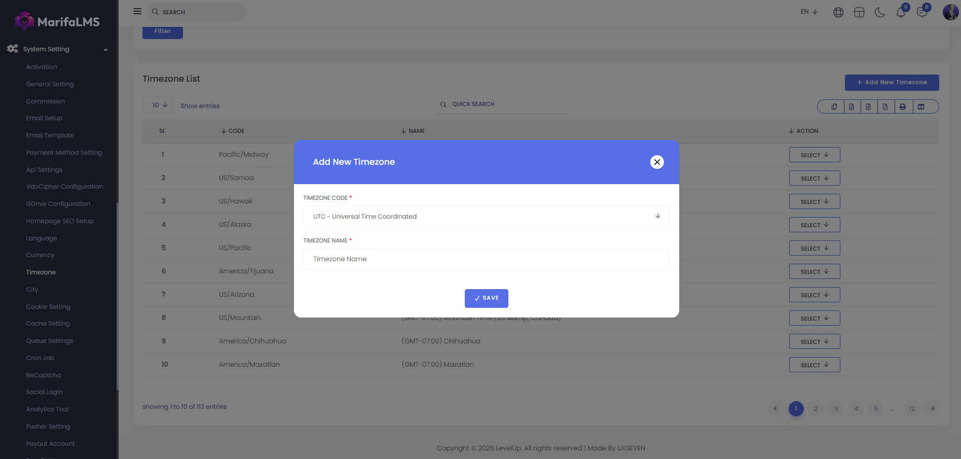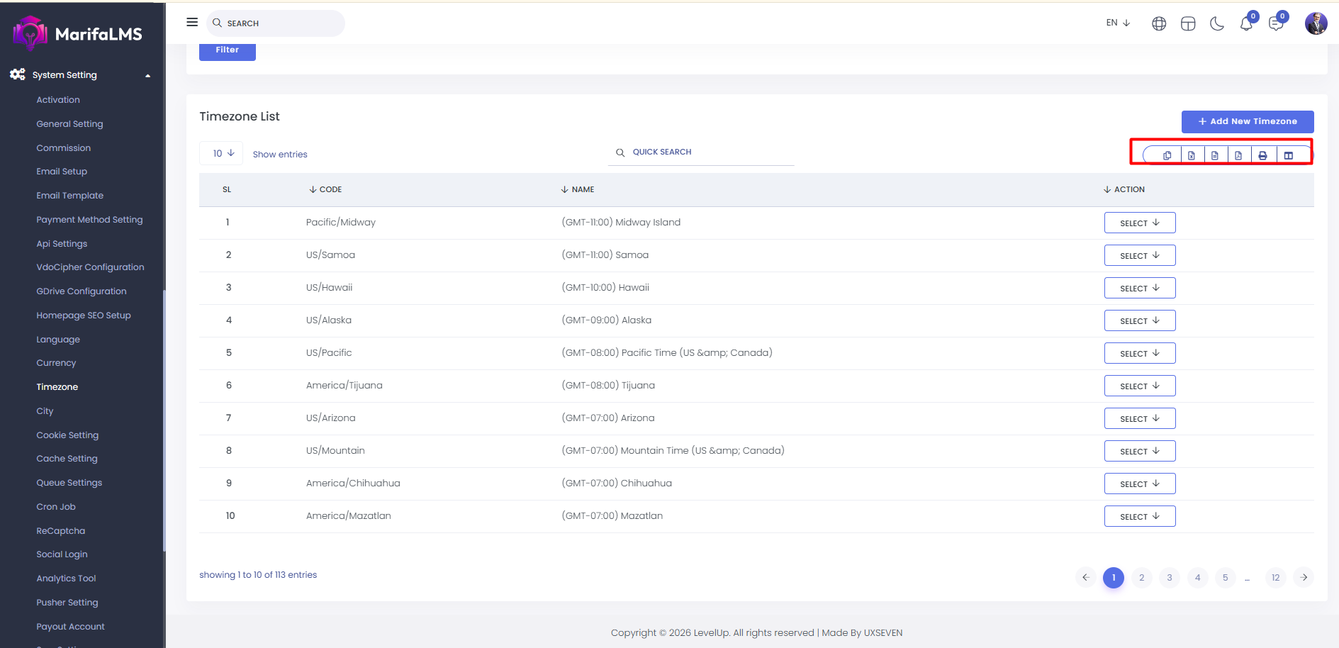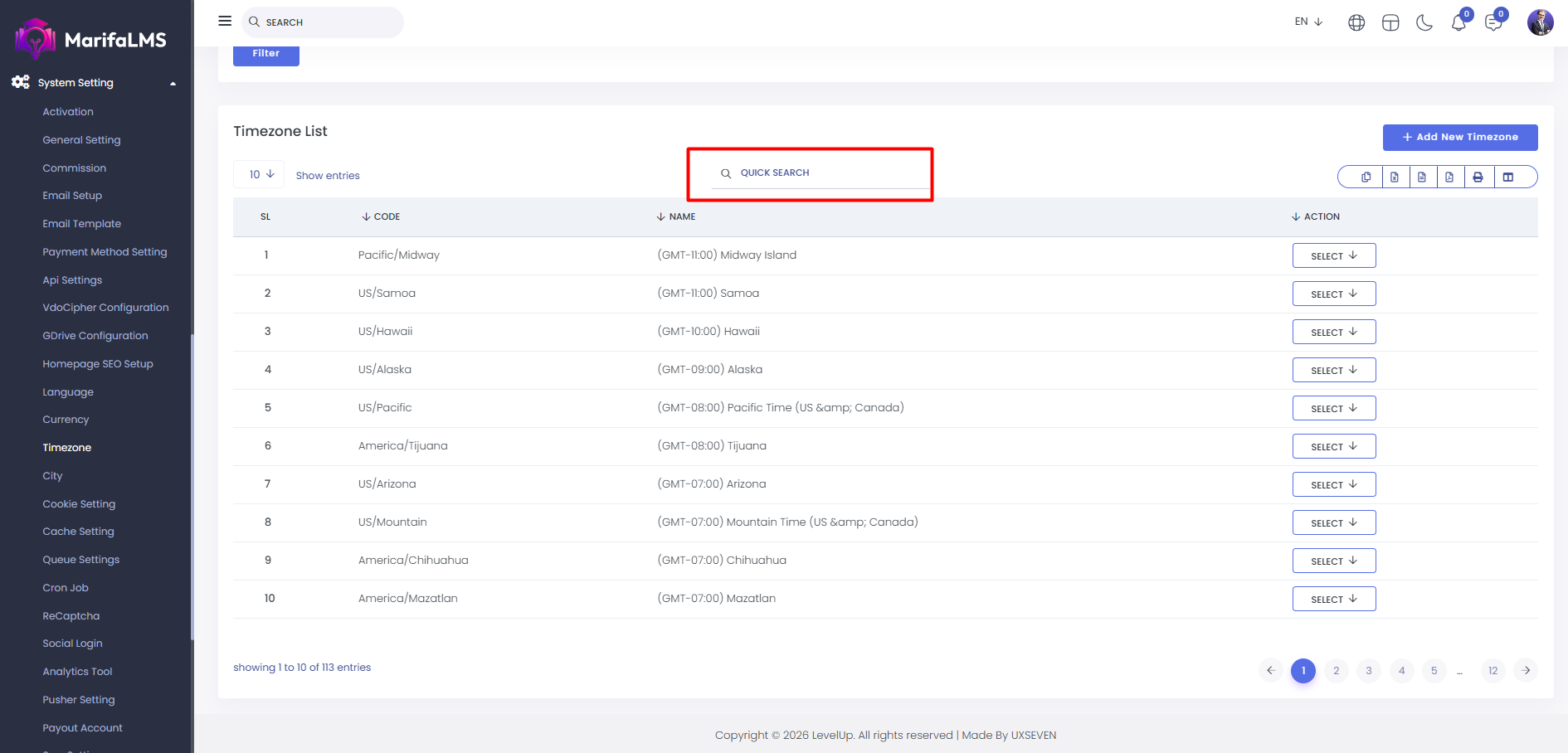 Time zone: Here, you can view the complete time zone list with details, including the name, country, and available actions.