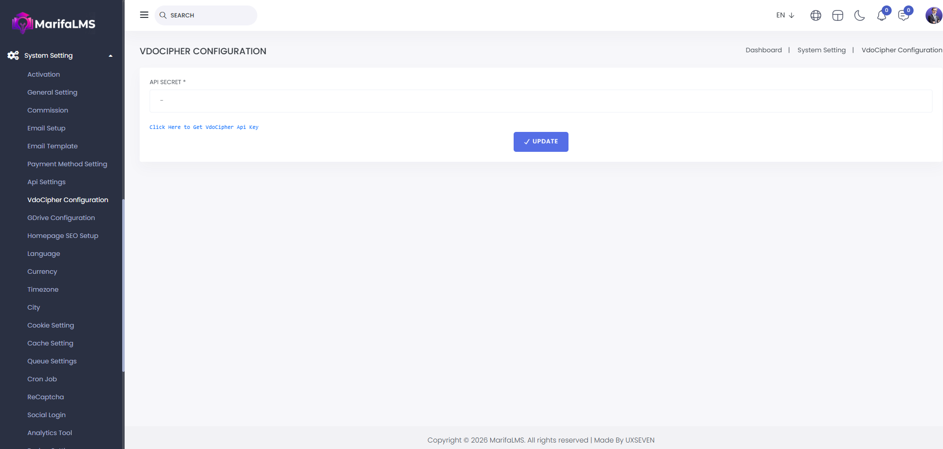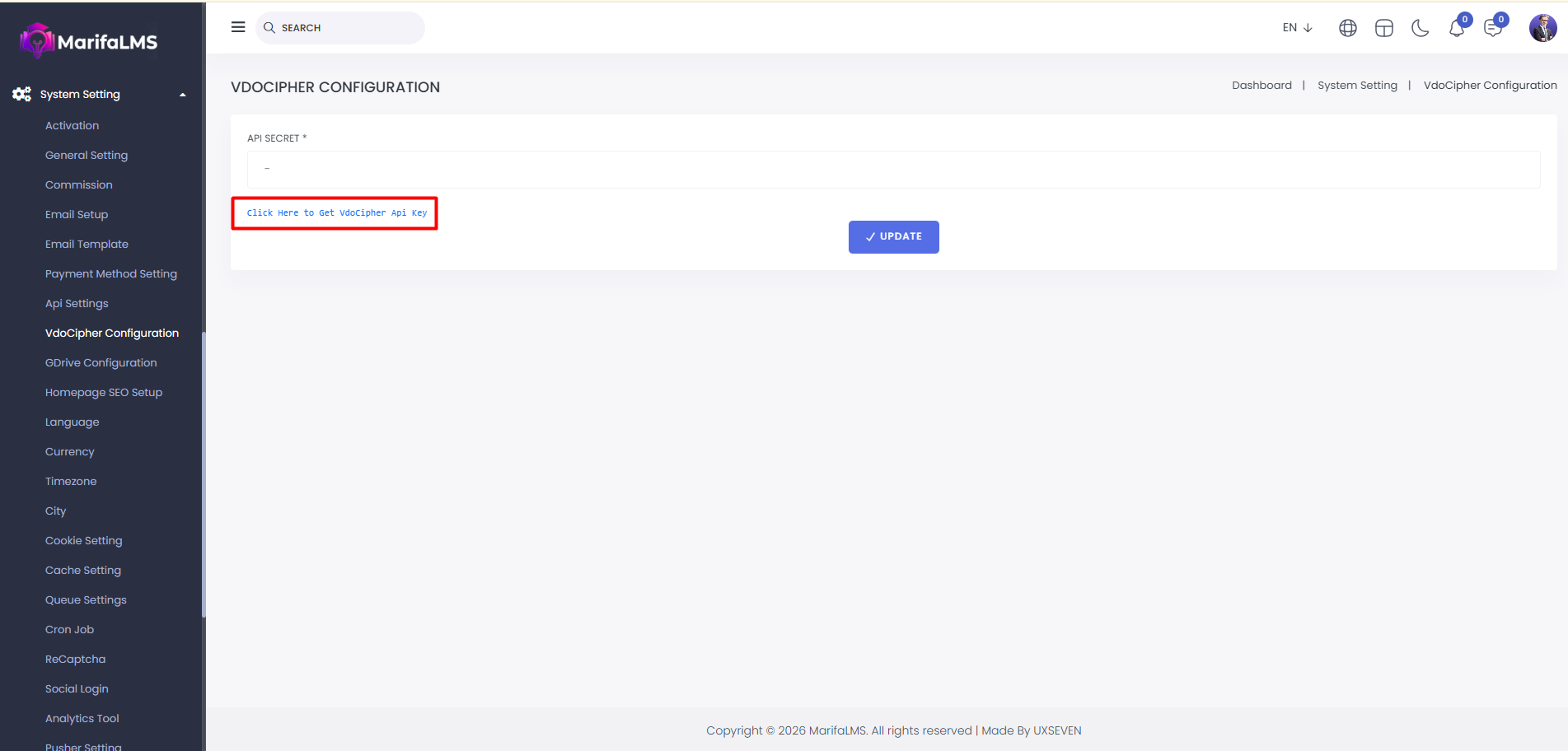 Vdocipher Configuration: Set up VdoCipher by entering the API secret and clicking "Update" to save your configuration successfully.