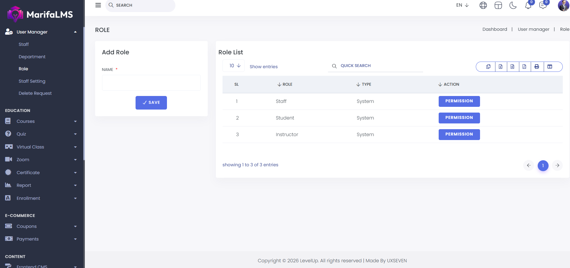 Clicking the "Permission" button allows you to grant access to any module for a specific role.