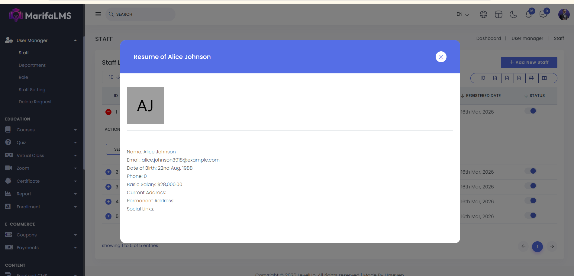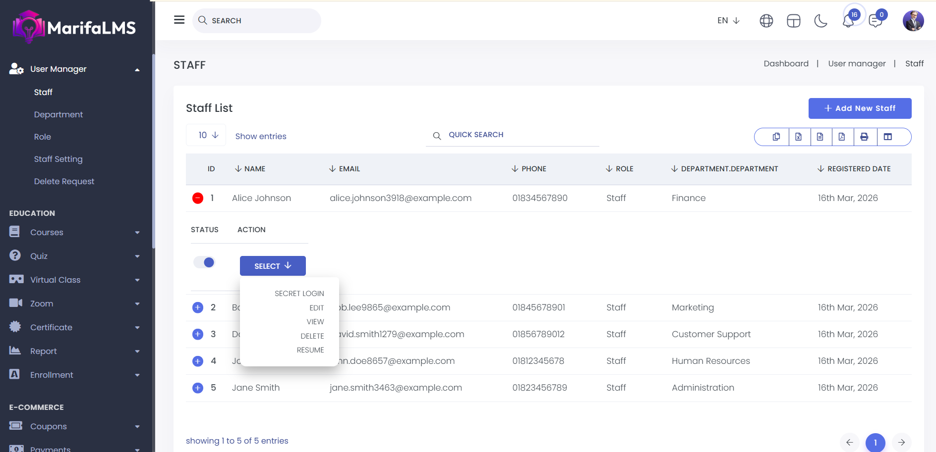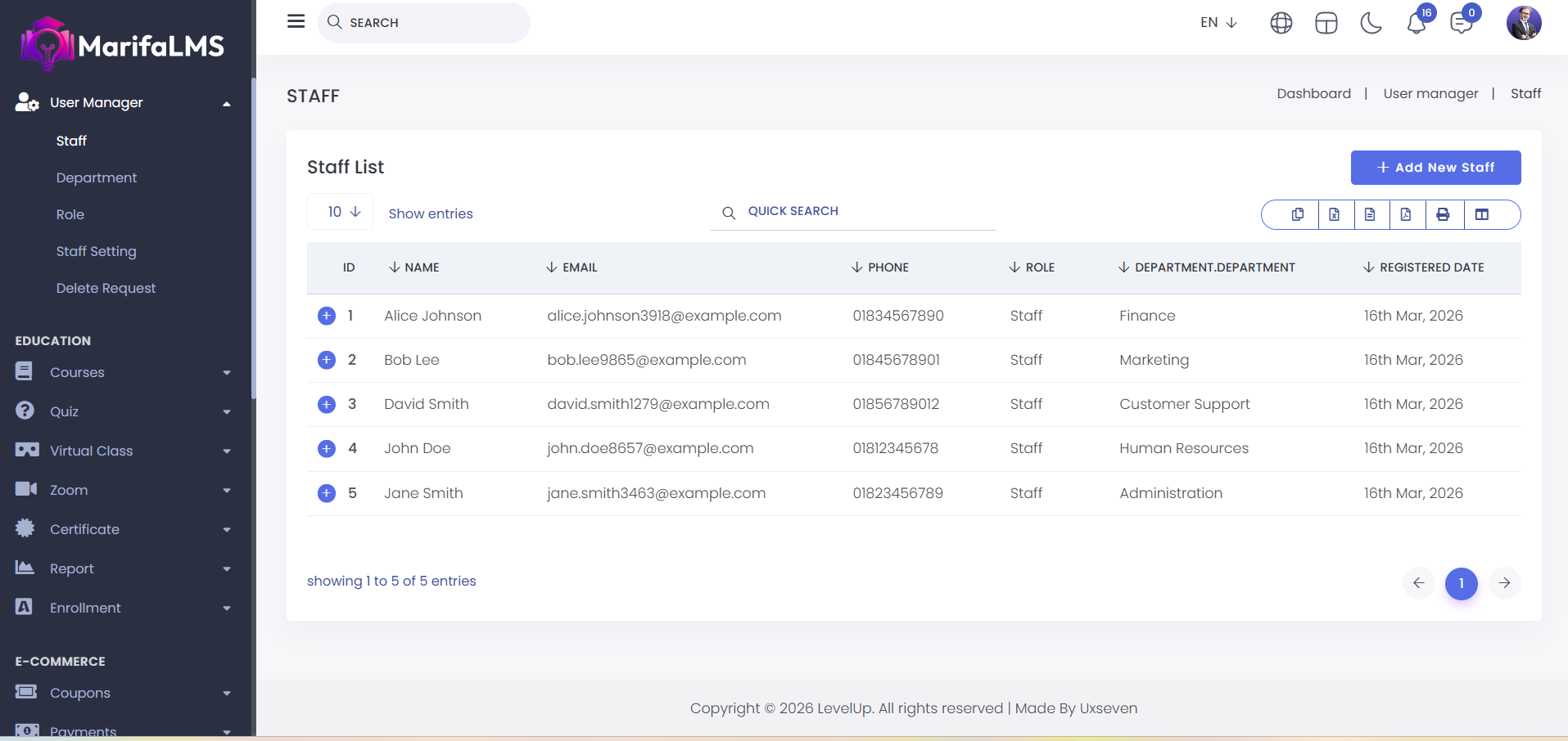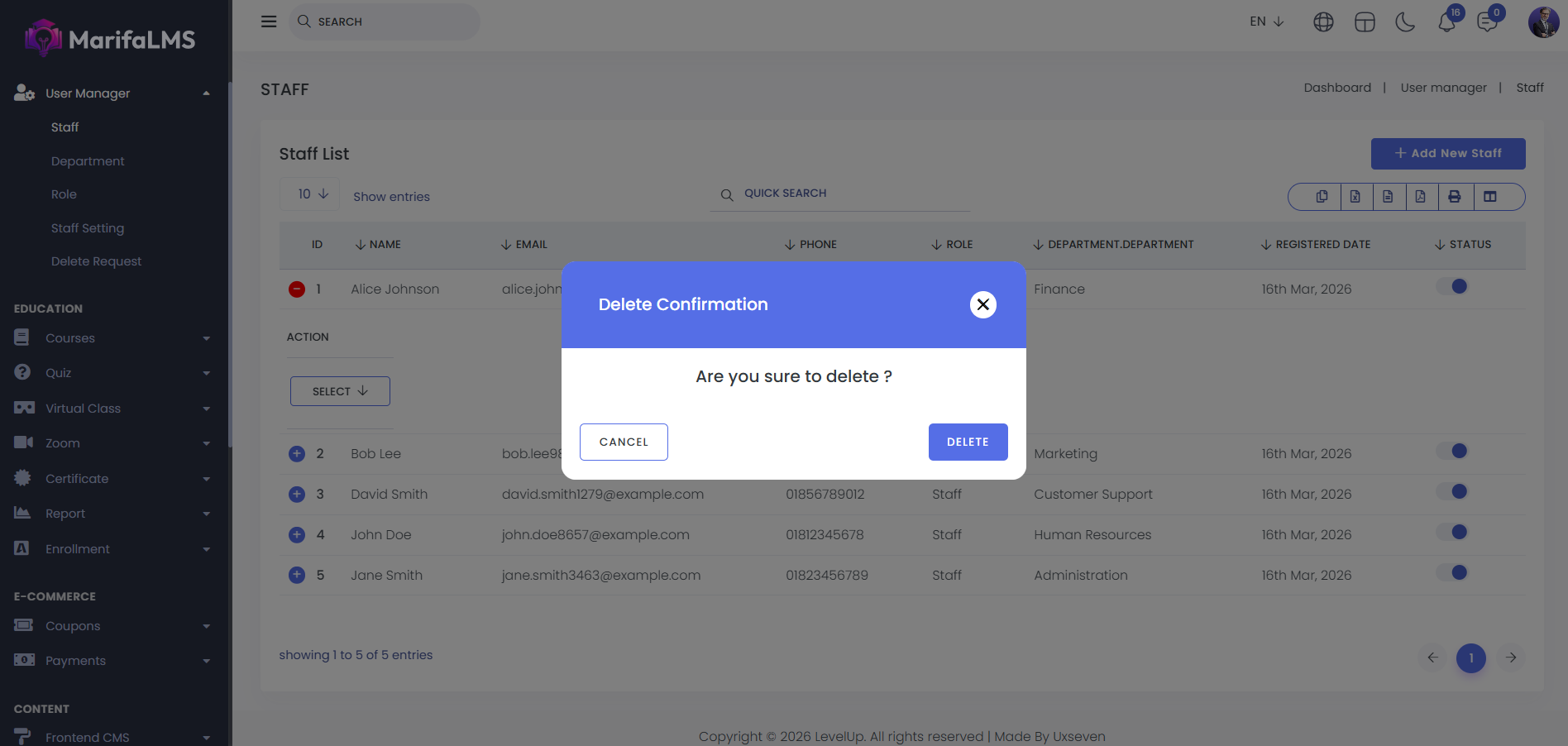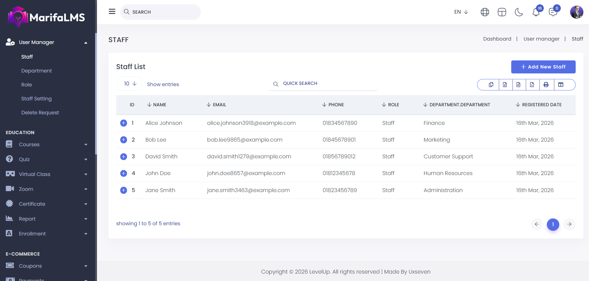 Staff: From here, you can view the complete staff list along with details such as ID, Name, Email, Phone, Role, Department, Registered Date, Status, and Action.