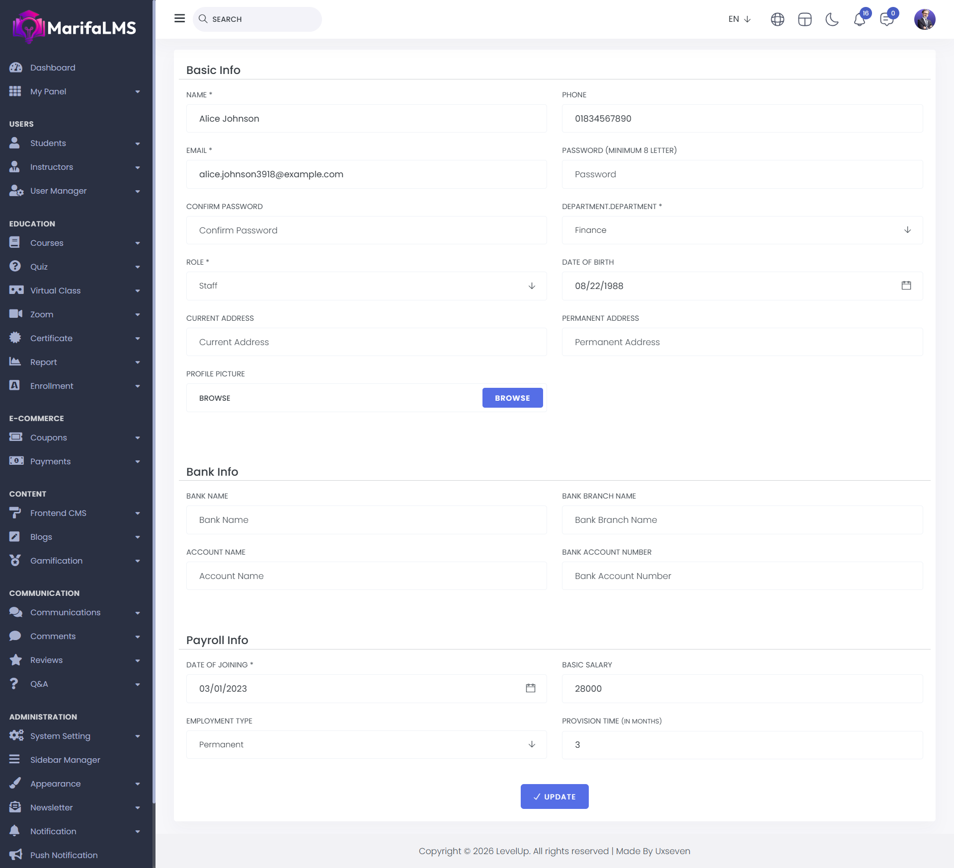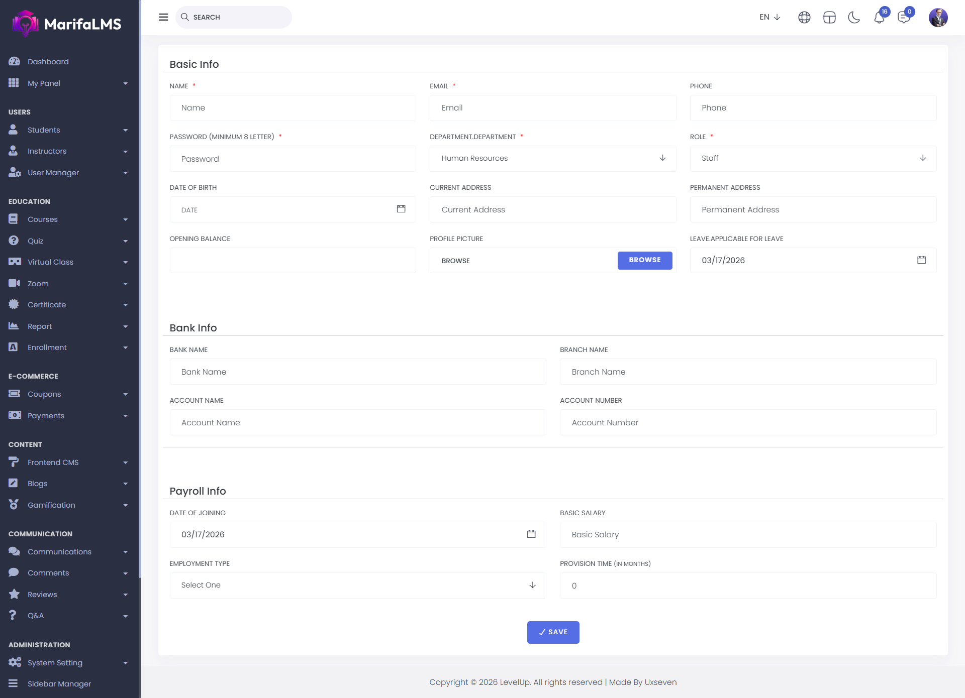 Add New: From here, you can add new staff. To do so, click on the "Add New" button, then fill in the following details: Name, Email, Phone, Password, Department, Role, Date of Birth, Current Address, Permanent Address, Opening Balance, Profile Picture, and whether they are "Applicable for Leave." Additionally, you need to fill in the Bank Name, Branch Name, Account Name, Account Number, Date of Joining, Basic Salary, Employment Type, and Probation Time. After filling up this just click on save new stuff will be created successfully.