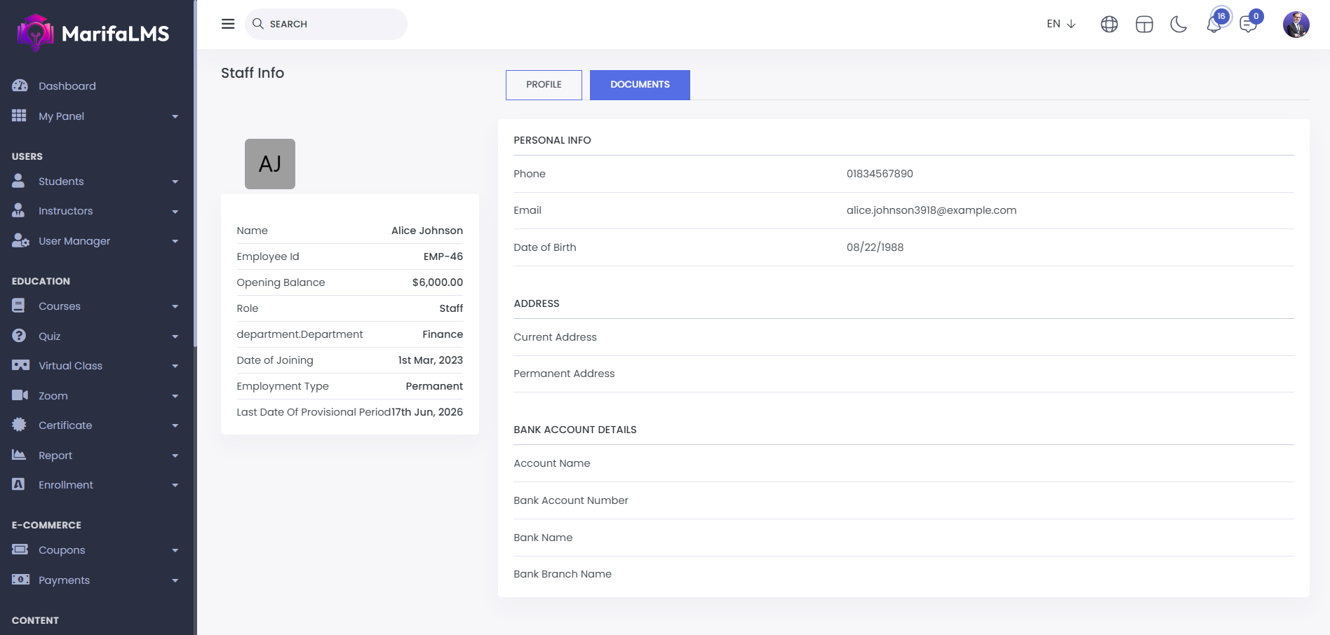 Documents: If you want to upload any type of document for a staff member, you can do so from here.