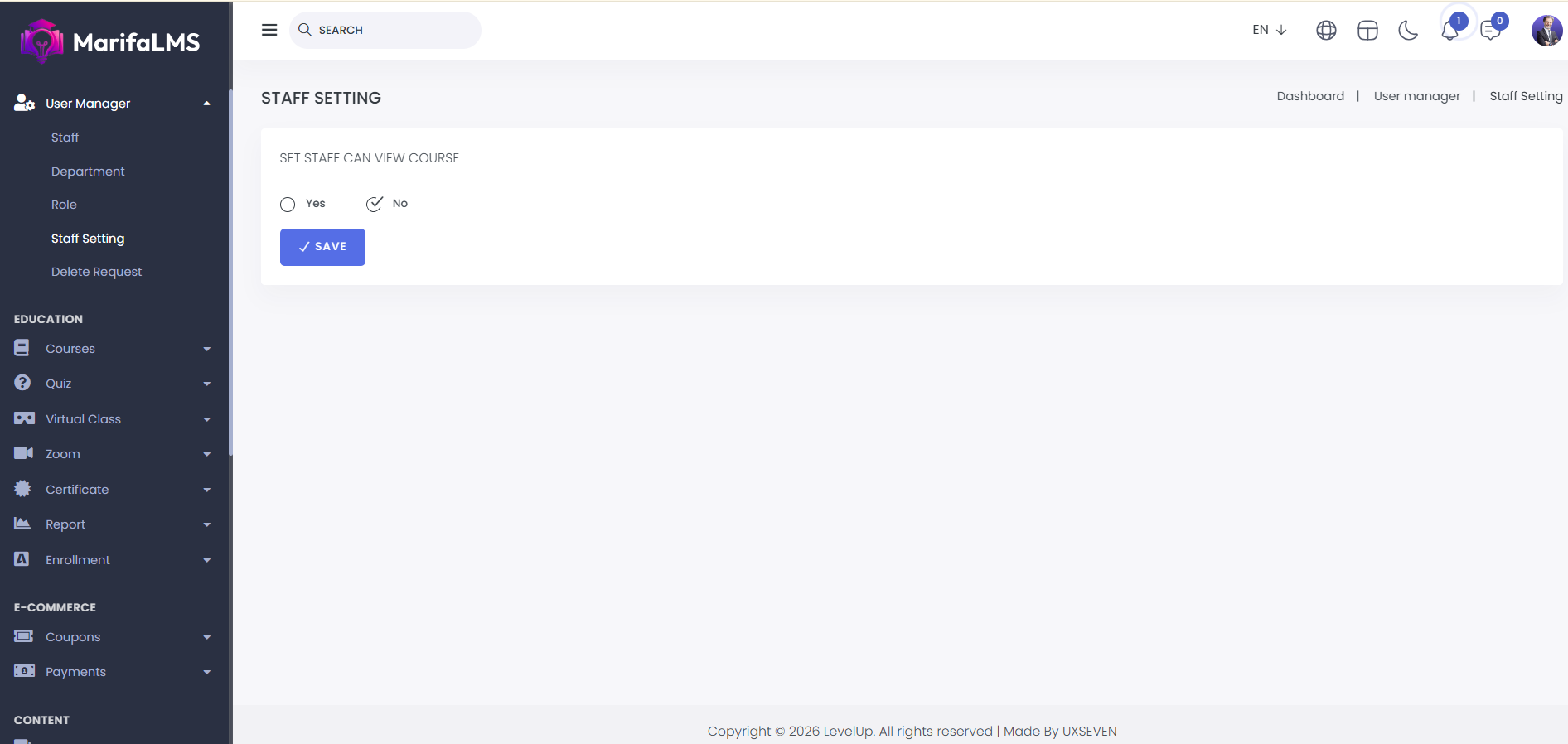 Staff Settings: Here, you can set whether the course will be visible to staff or not. After making the changes, click "Save" to update your settings.