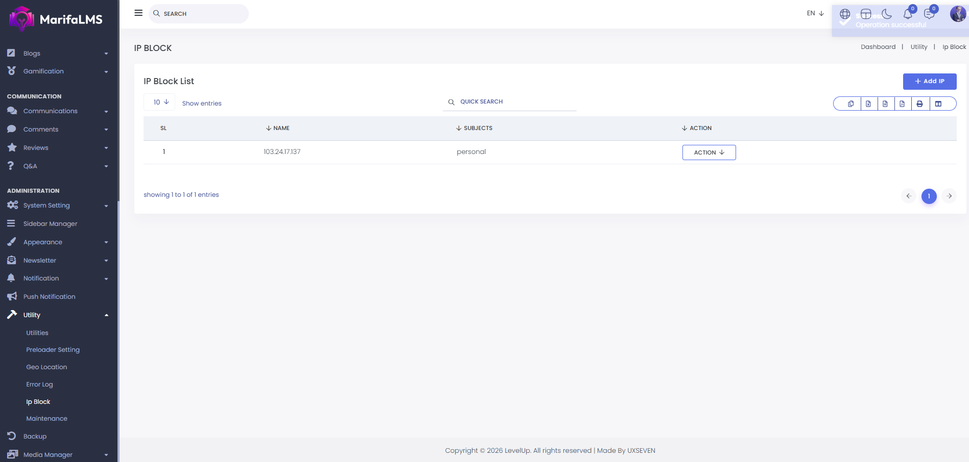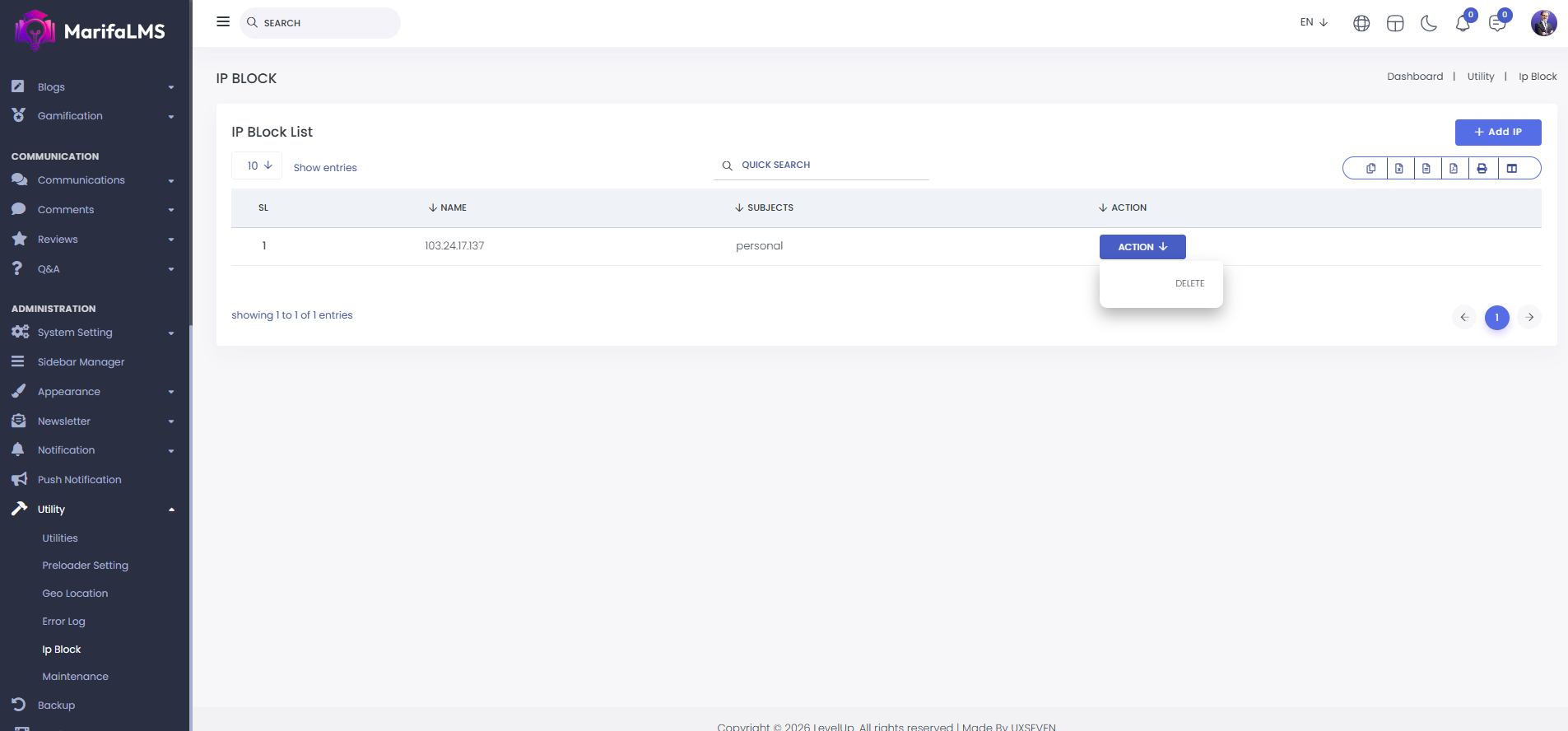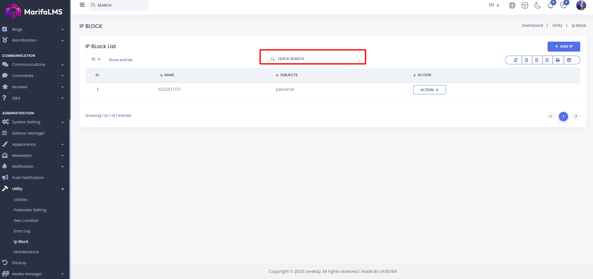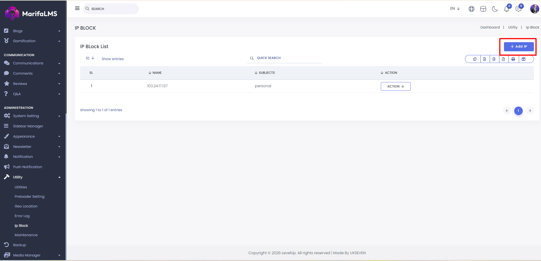 IP Block List: If you want to block a specific IP from accessing the website, you can do so here. You can view the list of blocked IPs, along with the IP address, associated subjects, and available actions.